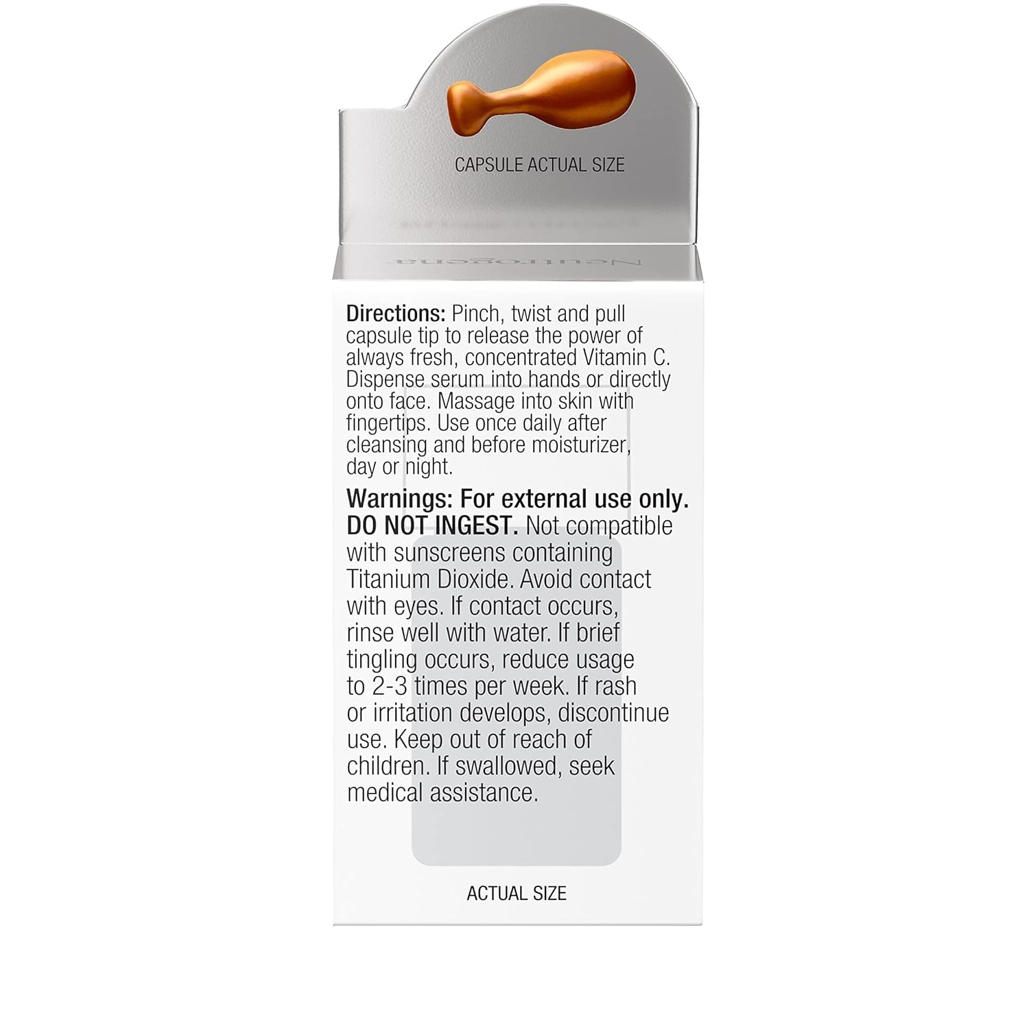 To use, pinch, twist and pull capsule tip to release the power of fresh, concentrated Vitamin C. Each seaweed derived capsule is biodegradable in water and the serum is paraben-, preservative-, alcohol-, oil-, fragrance- and dye-free