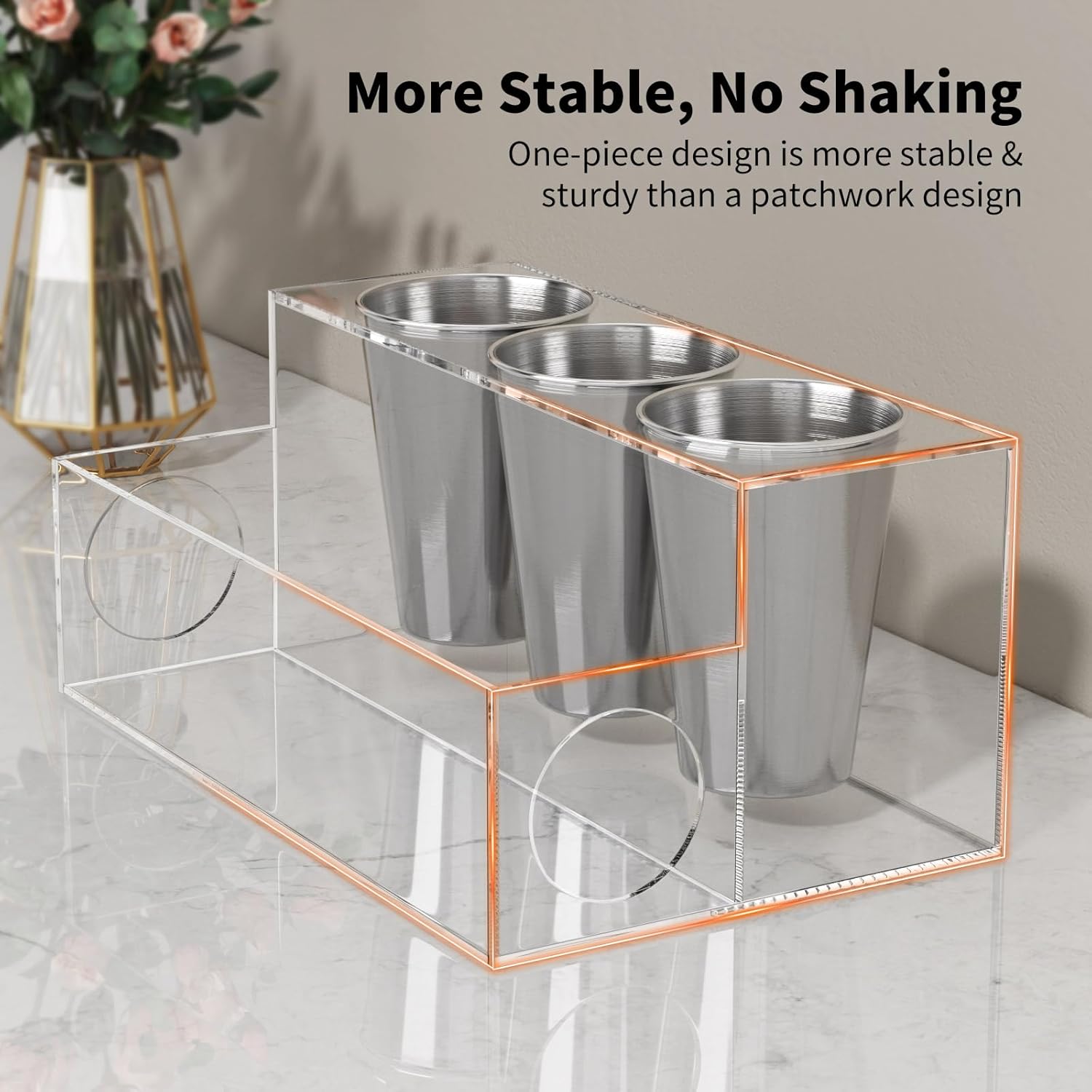 SPACE SAVING & EASY TO CLEAN – Our acrylic makeup storage racks are compact in design. They take up minimal space on small bathroom countertops, narrow dressing tables or hair care tables, but provide large storage capacity and are very easy to clean. Three stainless steel cups can be taken out. , The acrylic shelf can also be washed directly with water or wiped with a wet towel.