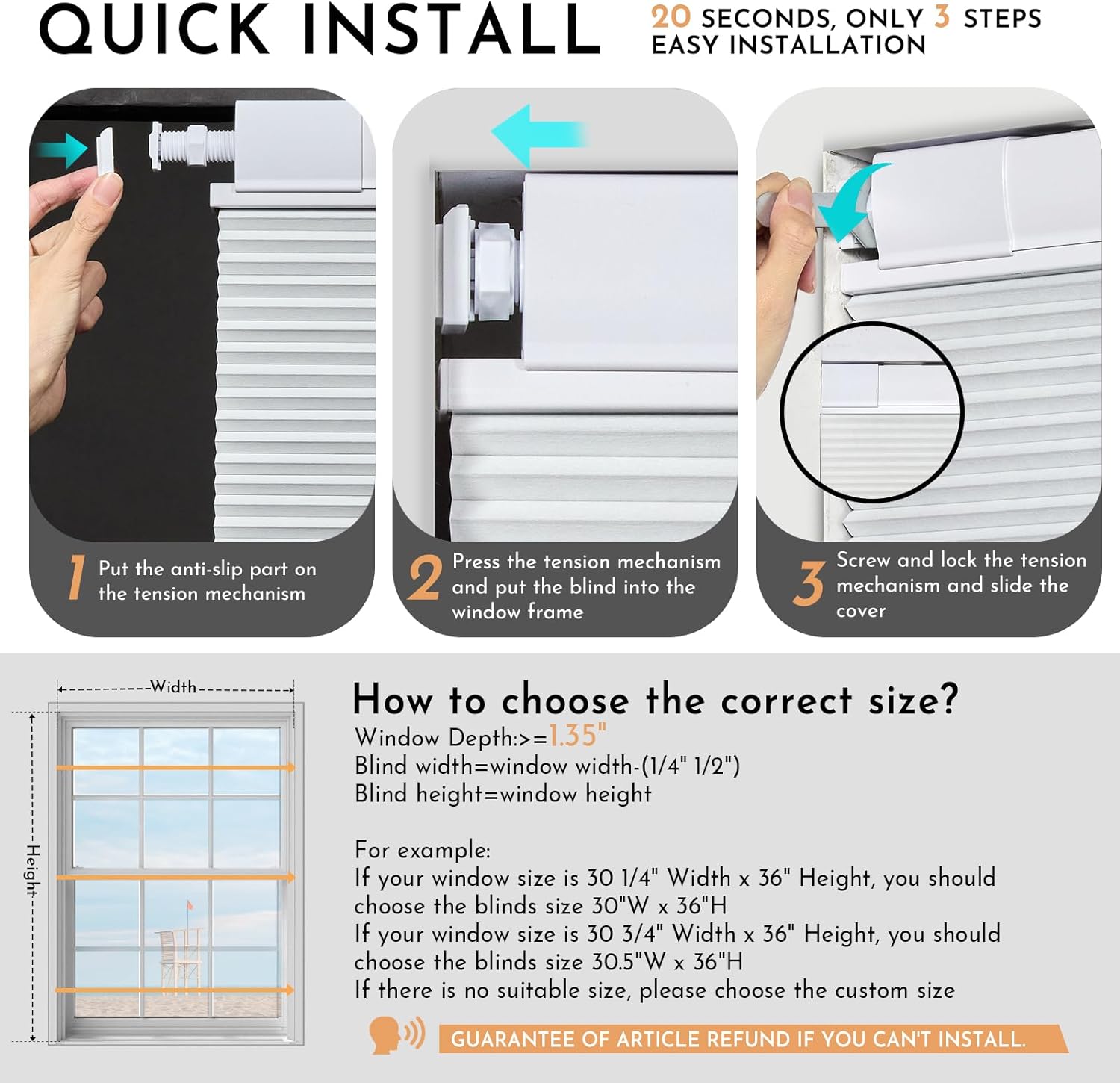 【No Drill No Tools Installation】 No tools, brackets, or screws required, ensuring zero damage to your walls or window frames. Our no-drill blinds are both stable and secure. It is very convenient for renters and students to take away at any time. GUARANTEE OF ARTICLE REFUND IF YOU CAN’T INSTALL.