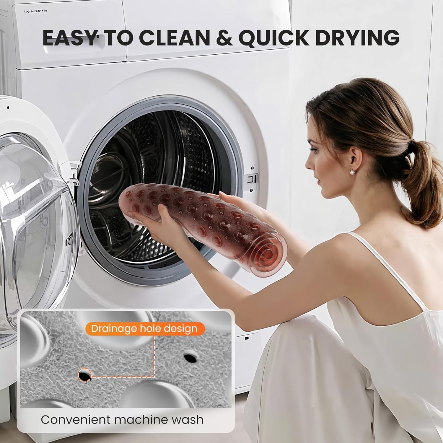 Easy Machine Washing:Say goodbye to hand-scrubbing! This machine-washable mat rinses away soap scum and debris effortlessly, maintaining its shape and grip after every wash. Keep your bathroom fresh with minimal effort.