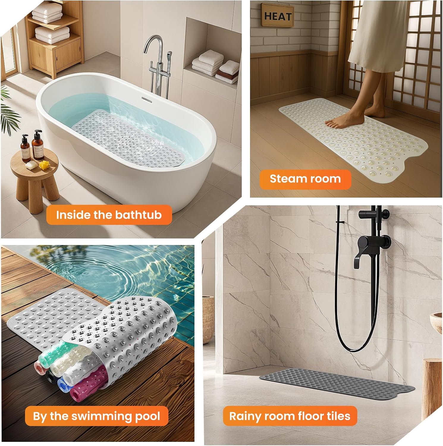 Powerful Non-Slip Protection:Equipped with 200 strong suction cups and a textured surface, this mat stays firmly in place on wet tub or shower floors. Ideal for families, it reduces slip risks for kids, elders, and anyone seeking secure bathing.