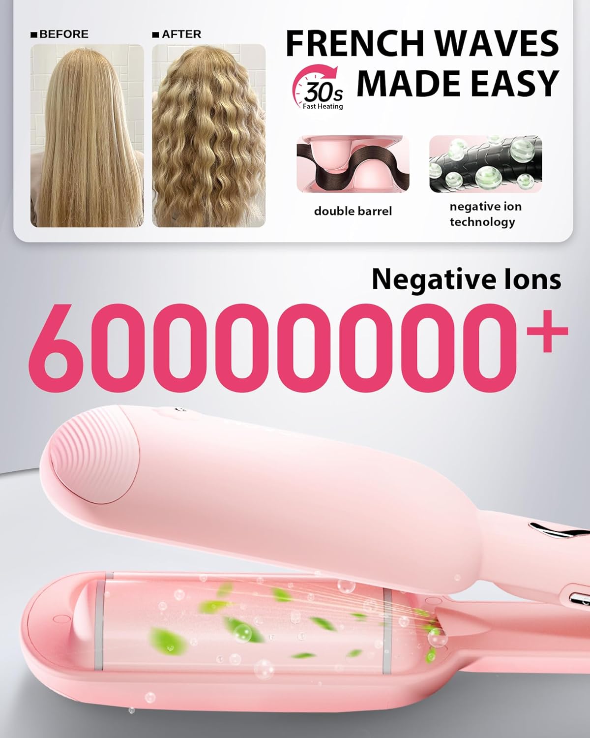 NOVUS Waver Curling Iron, Beach Waves Curling Wand, Ionic Hair Waver with Anti-Scald Hair Crimper, Easy to Use, 2 Barrel Hair Crimper for All Hair Types Women, Pink, 1.25 Inch