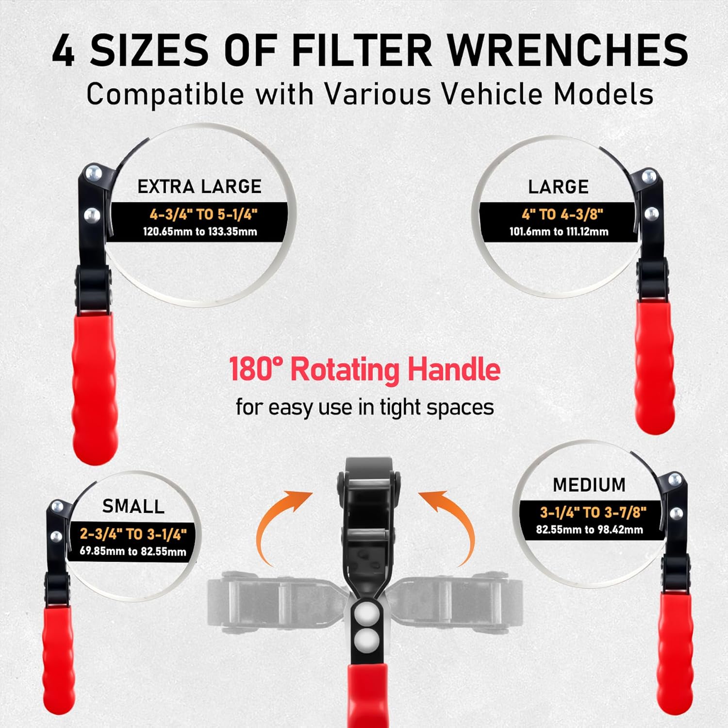 Versatile Swivel Oil Filter Wrenches: Each wrench features a textured band for a secure grip and can rotate 180 degrees for effortless maneuverability. The sizes are as follows: SMALL: 2-3/4″ to 3-1/4″ (69.85mm to 82.55mm), MEDIUM: 3-1/4″ to 3-7/8″ (82.55mm to 98.42mm), LARGE: 4″ to 4-3/8″ (101.6mm to 111.12mm), and EXTRA LARGE: 4-3/4″ to 5-1/4″ (120.65mm to 133.35mm). Tackle any filter with confidence and ease