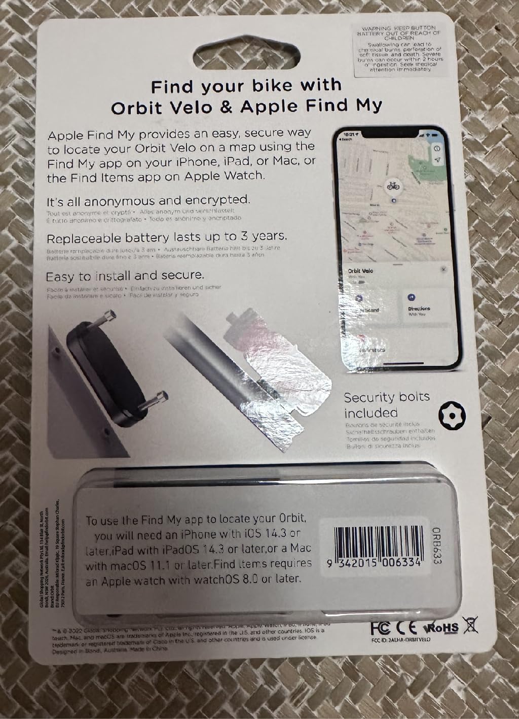 Apple Find My provides an easy secure way to locate your Orbit Velo on a map using the Find My app on your iPhone, iPad, or Mac, or the Find Items app on Apple Watch.