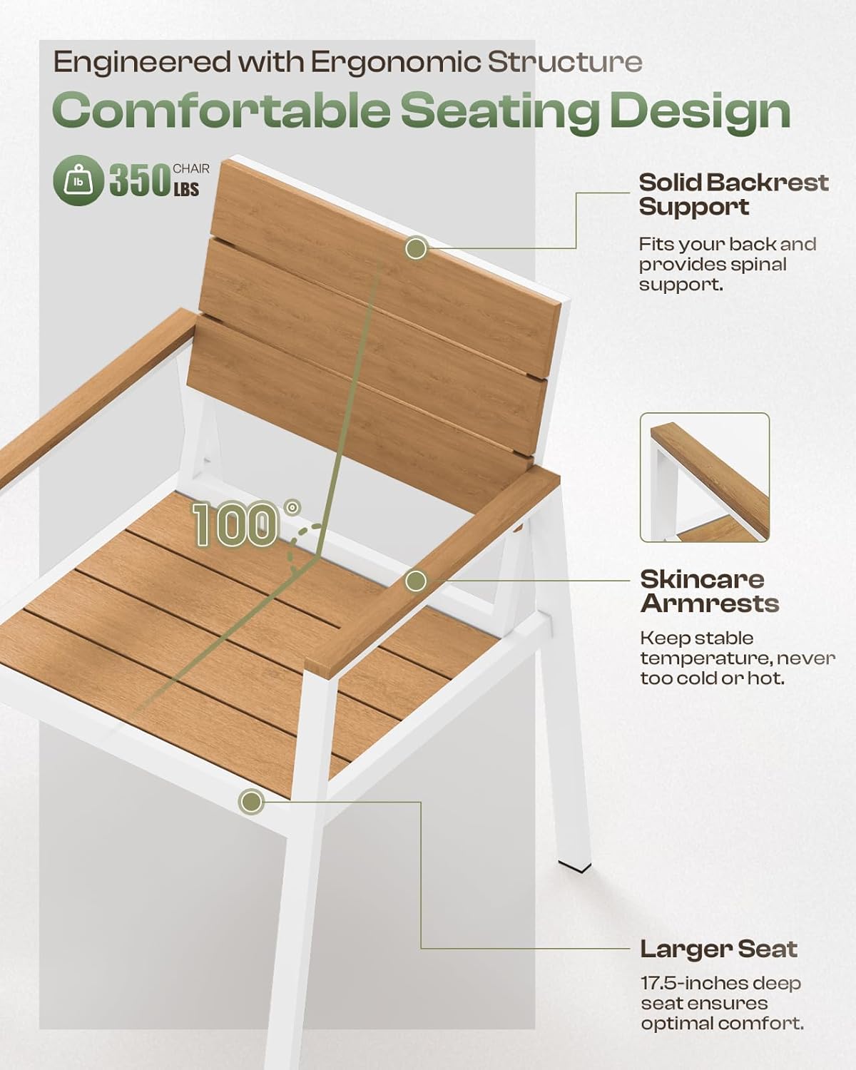 Premium Material: This outdoor table and chairs set is crafted with high-quality aluminum frame and HDPS material. The aluminum frame features a double-layer design, engineered for exceptional stability and load-bearing capacity. The HDPS tabletop offers a natural wood-like finish, combining elegance with durability and weather resistance