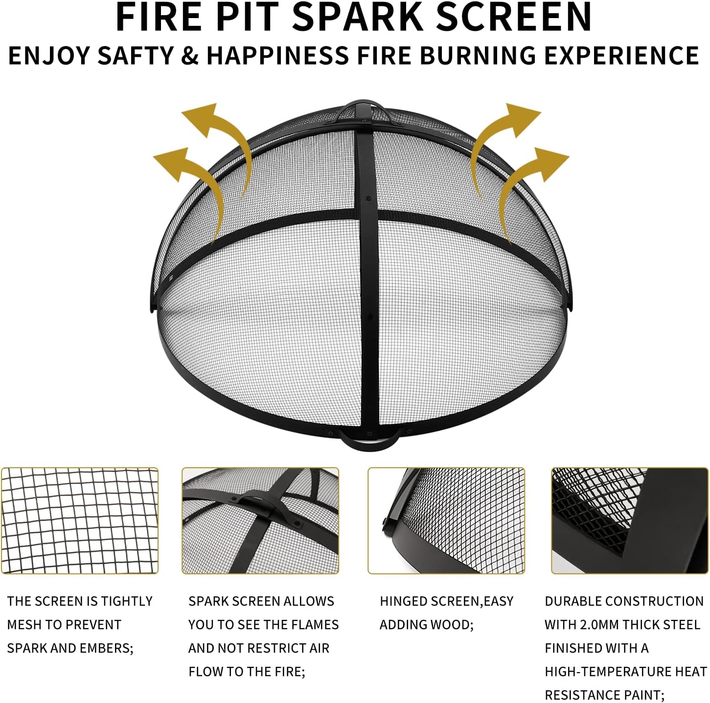 Excellent Secure Firepit Spark Screen:With 2 mm mesh design, fire pit screen has better effects on keeping sparks and embers from escaping; With hinge opening, round fire pits spark screen guard enables you to add woods and tend the fire securely without completely removing the screen.With 2 handles,it is convenient handle on top to lift the screen on and off