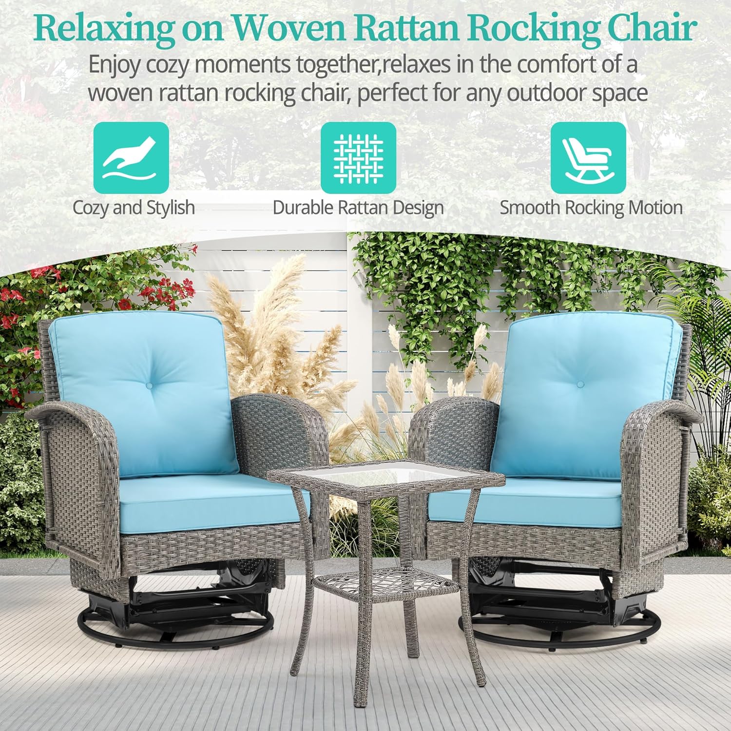 360° Swivel & Versatile Design:Experience full freedom of movement with the 360° swivel feature, allowing you to turn and chat effortlessly. Paired with a stylish glass-top side table, this patio furniture set is perfect for creating a cozy retreat in your garden, poolside, or porch.