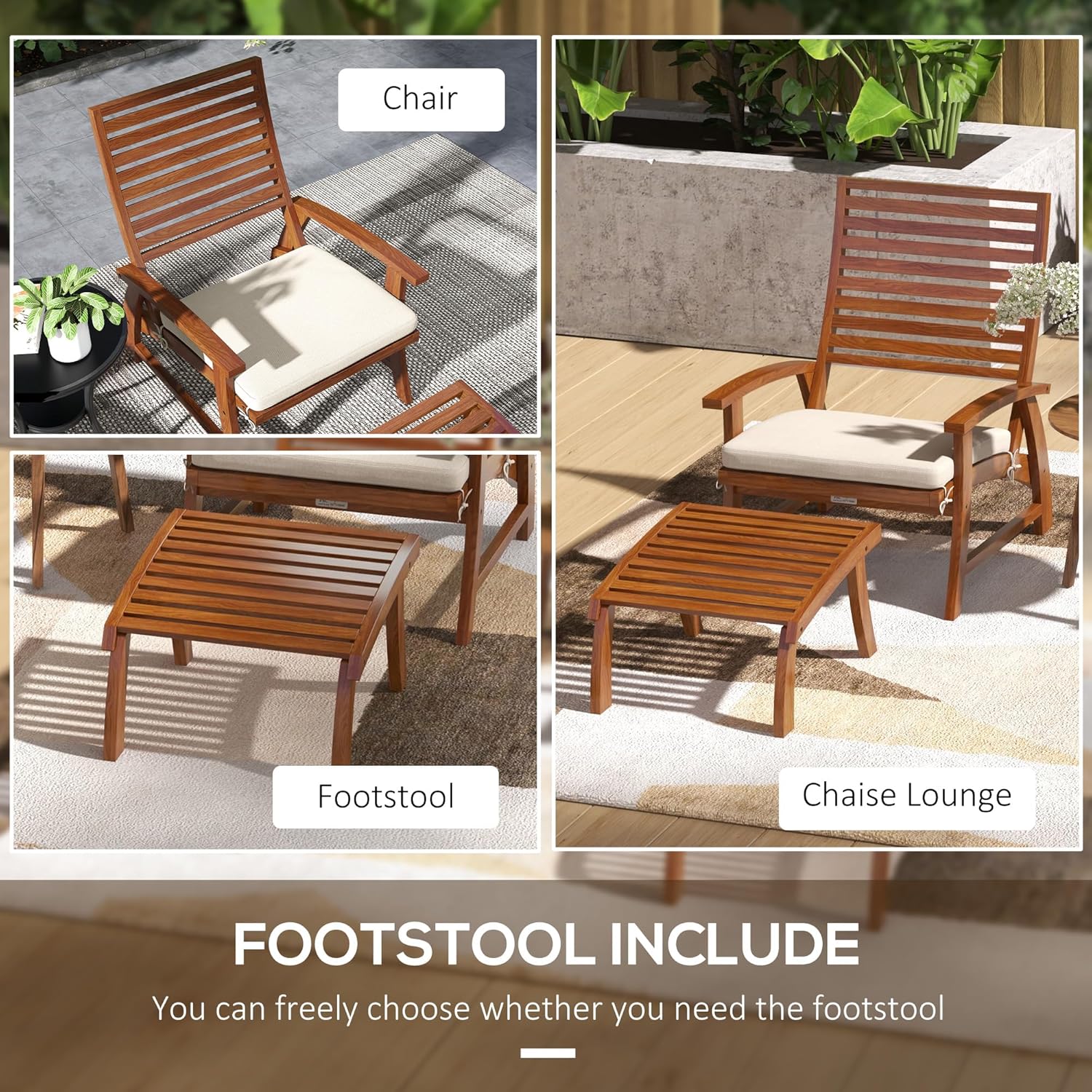 4 Pieces garden chair set features two chairs and two footstools Come with soft padded cushion to provide comfort seating Acacia wood structure with paint coating for extra protection Slatted design for air circulation and prevention of water build-up Great for indoor/outdoor, such as gardens, conservatories and entertaining spaces Assembly required