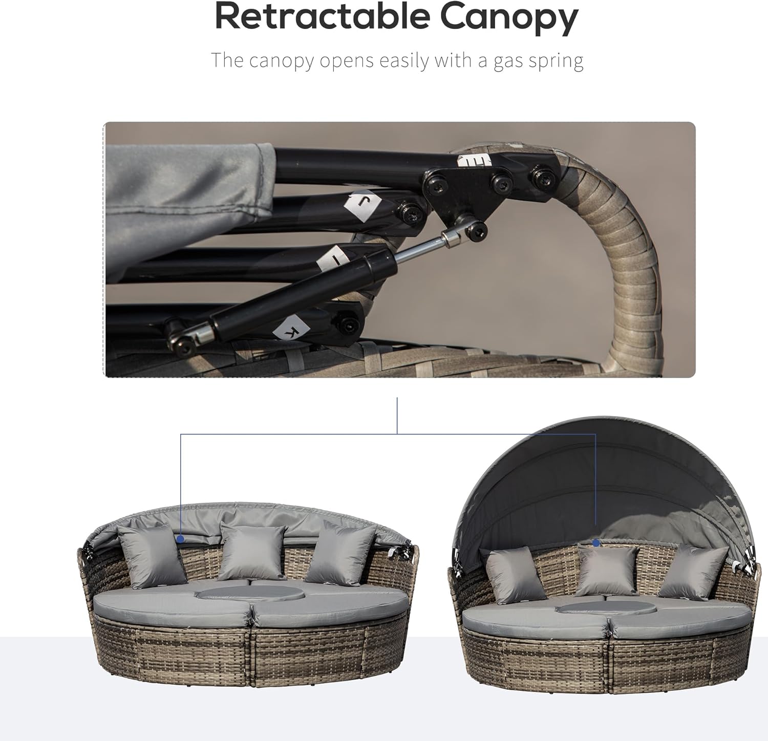 Retractable Canopy: Shield yourself from sunburns and eliminate glare by effortlessly opening the canopy of our round daybed. When you’re ready to soak up the sun, simply close the canopy and bask in the open air.