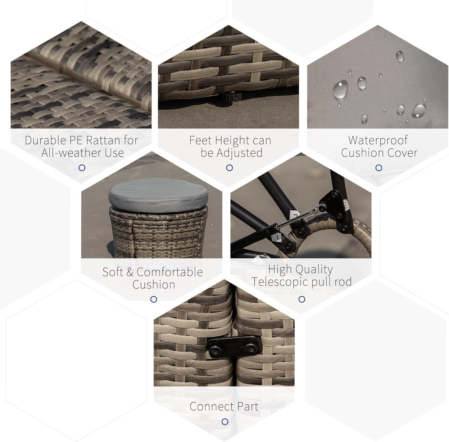 Convertible Rattan Furniture Set: The four-piece outdoor lounge furniture can be a round wicker daybed or a sofa with chairs and a tea table. Use the center as a chair, ottoman, or table. Choose from a variety of different layouts and combinations for different situations.