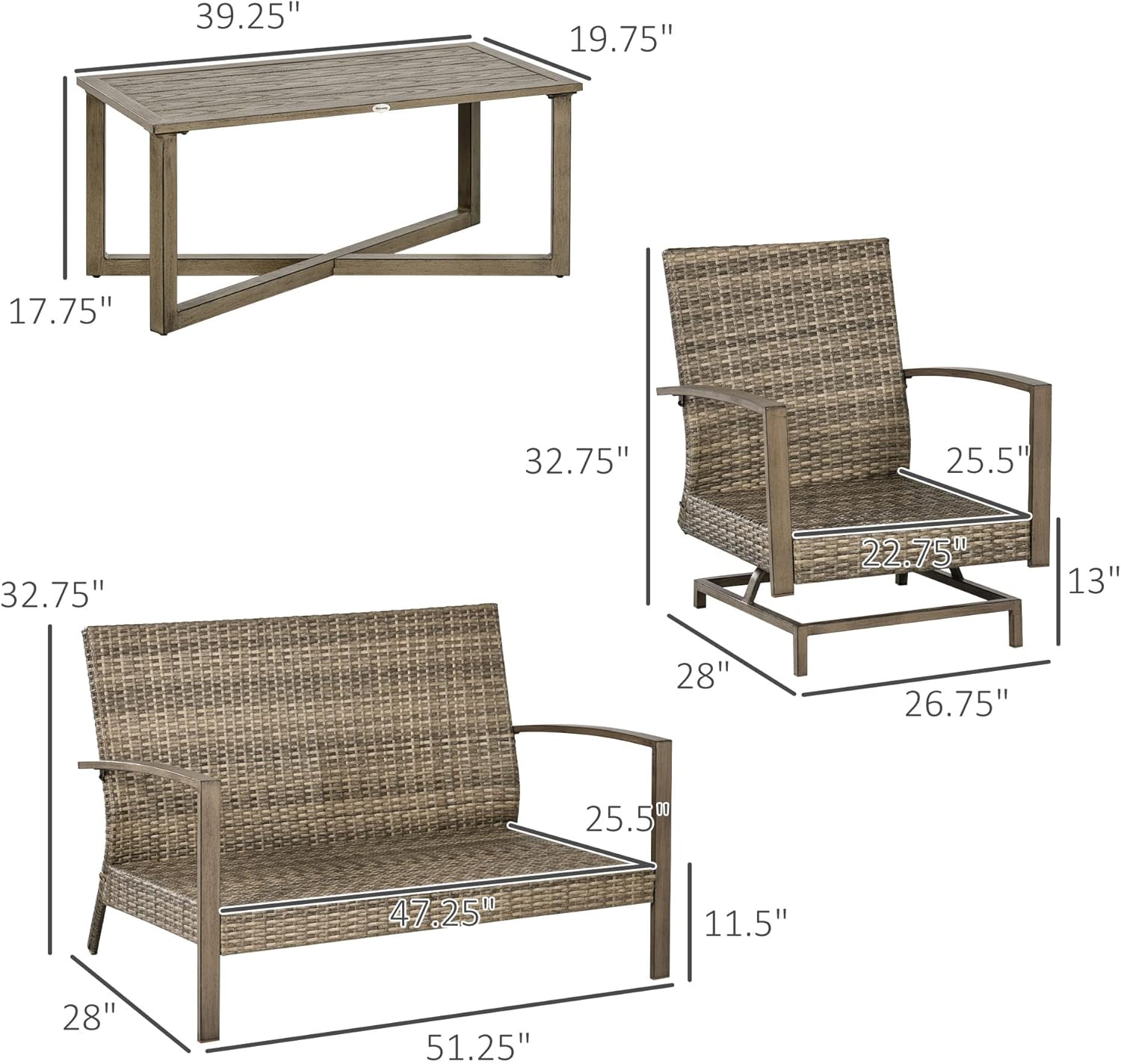 Outsunny 4 Piece Wicker Patio Furniture Set with 2 Rocking Chairs, Loveseat Sofa, Outdoor PE Rattan Conversation Set with Cushions, Aluminum Table for Porch, Poolside, Light Gray