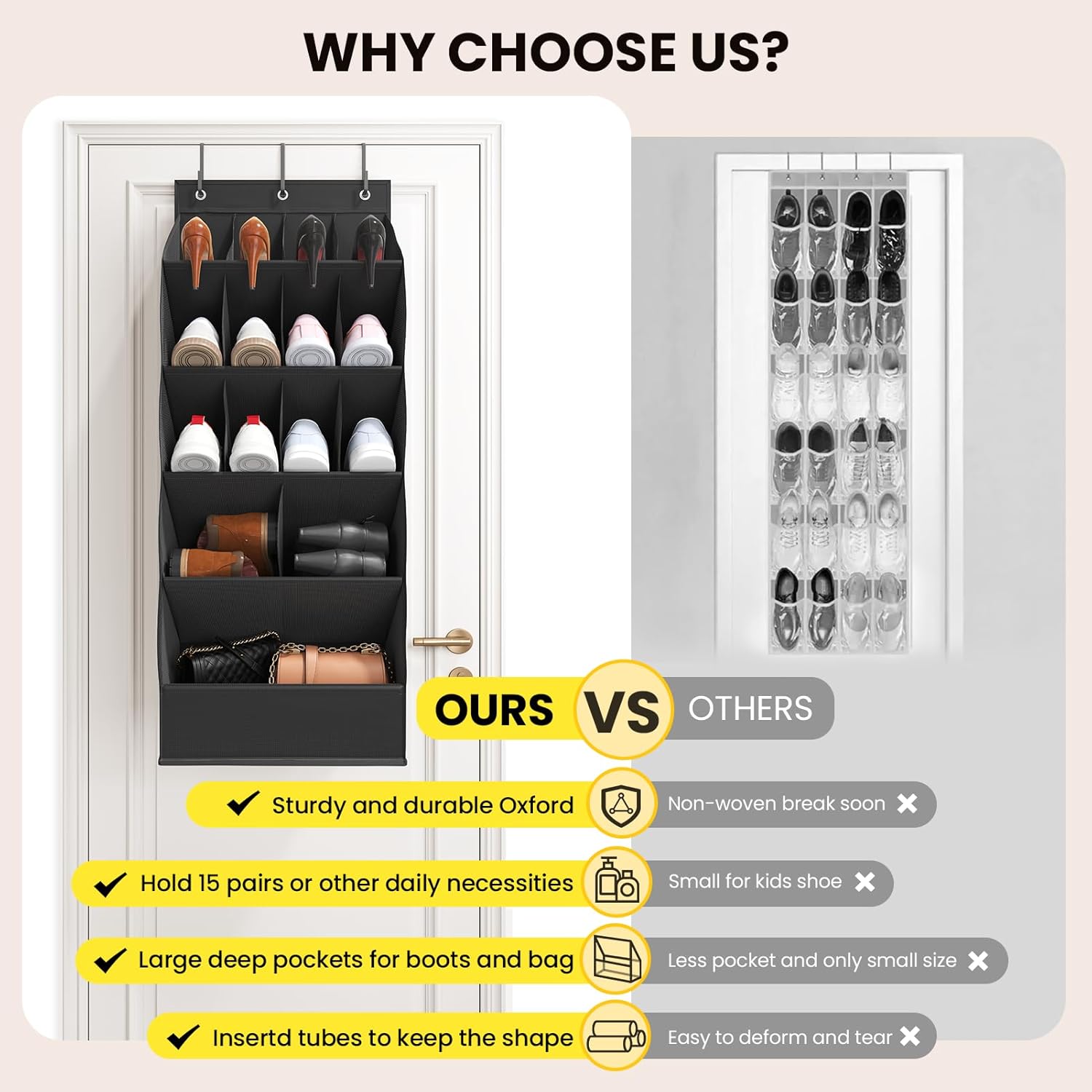 15 Extra-Large & Deep Compartments: Our over-the-door shoe organizer features 12 spacious compartments, 2 oversized pockets, and 1 jumbo-sized pocket—designed to hold 15-20 pairs of shoes. Effortlessly store bulky size 12+ boots, heels, sandals, or flip-flops. Offers 20% more capacity than standard organizers