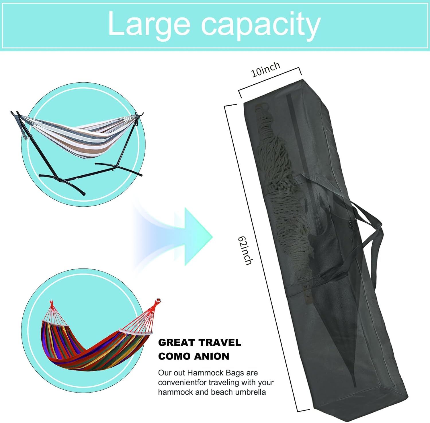 Extra Large Size : 62″L x 10″ Wx 10″H with extra-large capacity. Hammock storage bag can handle 2 Hammock and Steel Stand – fits for most outdoor Hammock and Steel Stand.