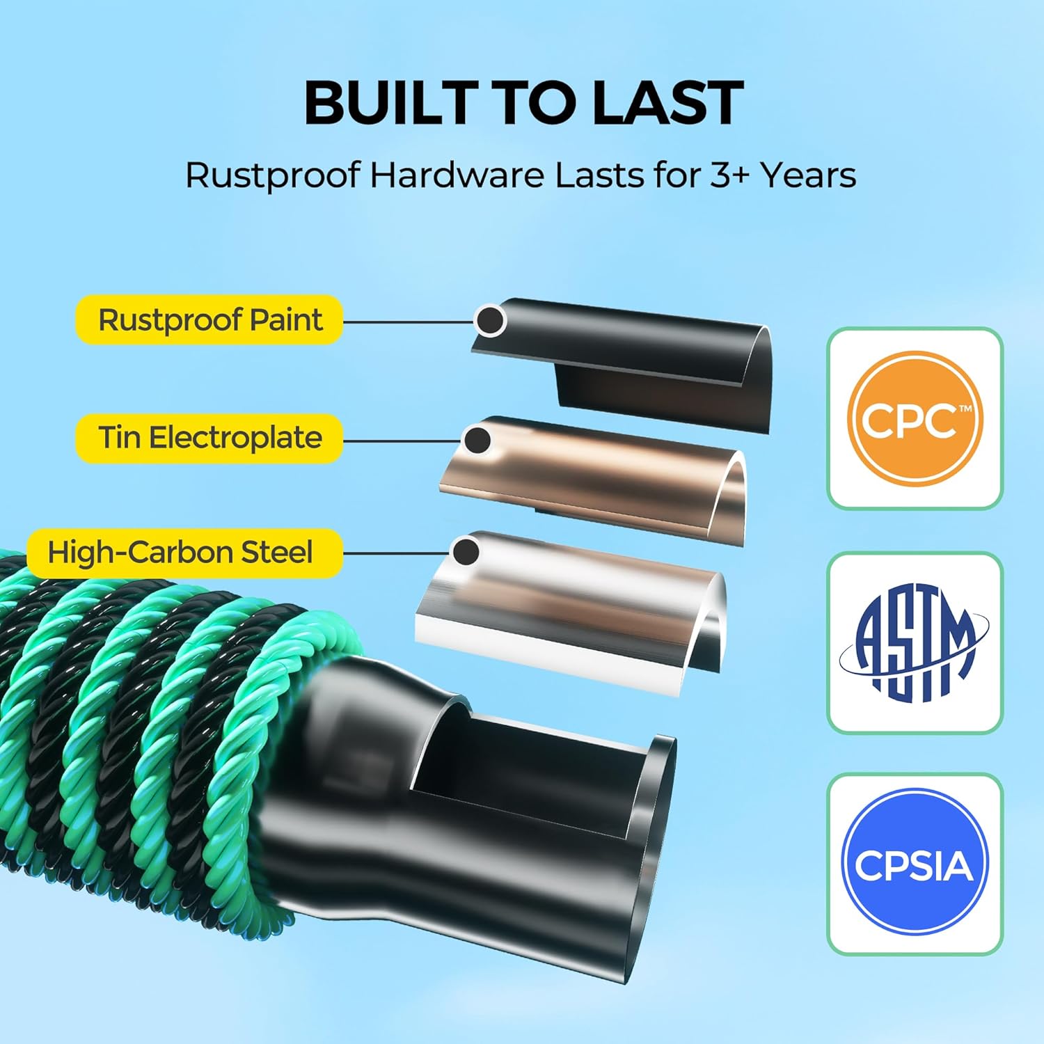 BUILT TO LAST QUALITY: At PACEARTH, we prioritize durability and safety. The swing frame is made of thick tin-plated steel tubes, painted with rustproof coating, and locked with sturdy eye bolts. Plus, the 8-strand ropes lasts 3X longer than standard 3-strand ones, ensuring years of backyard fun.