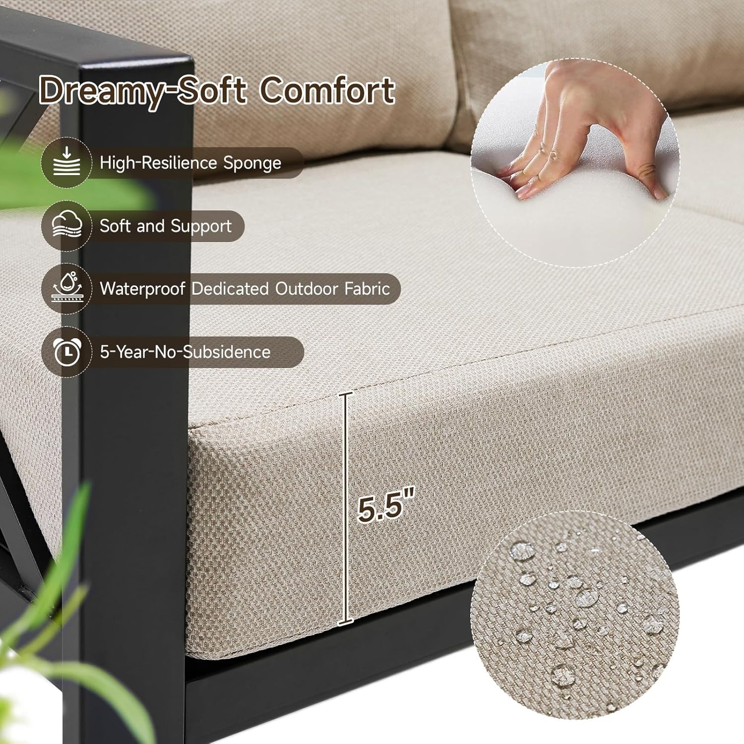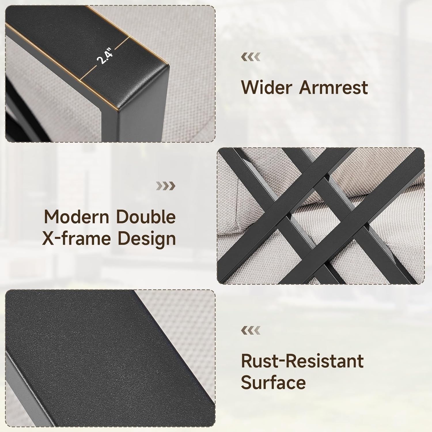 【All-Metal Frame】Are you tired of those flimsy outdoor couch that can’t withstand a bit of weather? Meet your all-metal BFF! Metal Patio Furniture Set crafted from sturdy steel and adopted electrophoresis+plastic spraying double surface treatment, like a superhero shield, this set laughs at rain, snow, and outdoor severe weather. folks! No more worrying about rust, bending or flaking