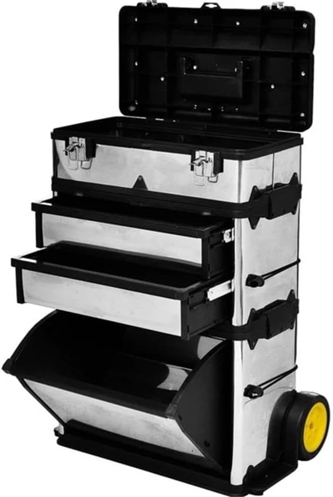 This tool box is a perfect setup for anyone who needs to travel with their tools frequently or as a highly-mobile, centralized place for hobby tools or arts crafts supplies. It contains 3 separable components: the traditional toolbox, the 2-drawer compartment, and the large bottom box. This handy toolbox features 2-drawer storage chest for holding small tools, parts and supplies. It also has a large, deep storage chest at the top and bottom each for bigger items. It rolls effortlessly on soft-rubber wheels. The heavy-gauge, non-corroding stainless steel and impact-proof PP construction ensure a long service. The large pull-handle extends to 5.9″.