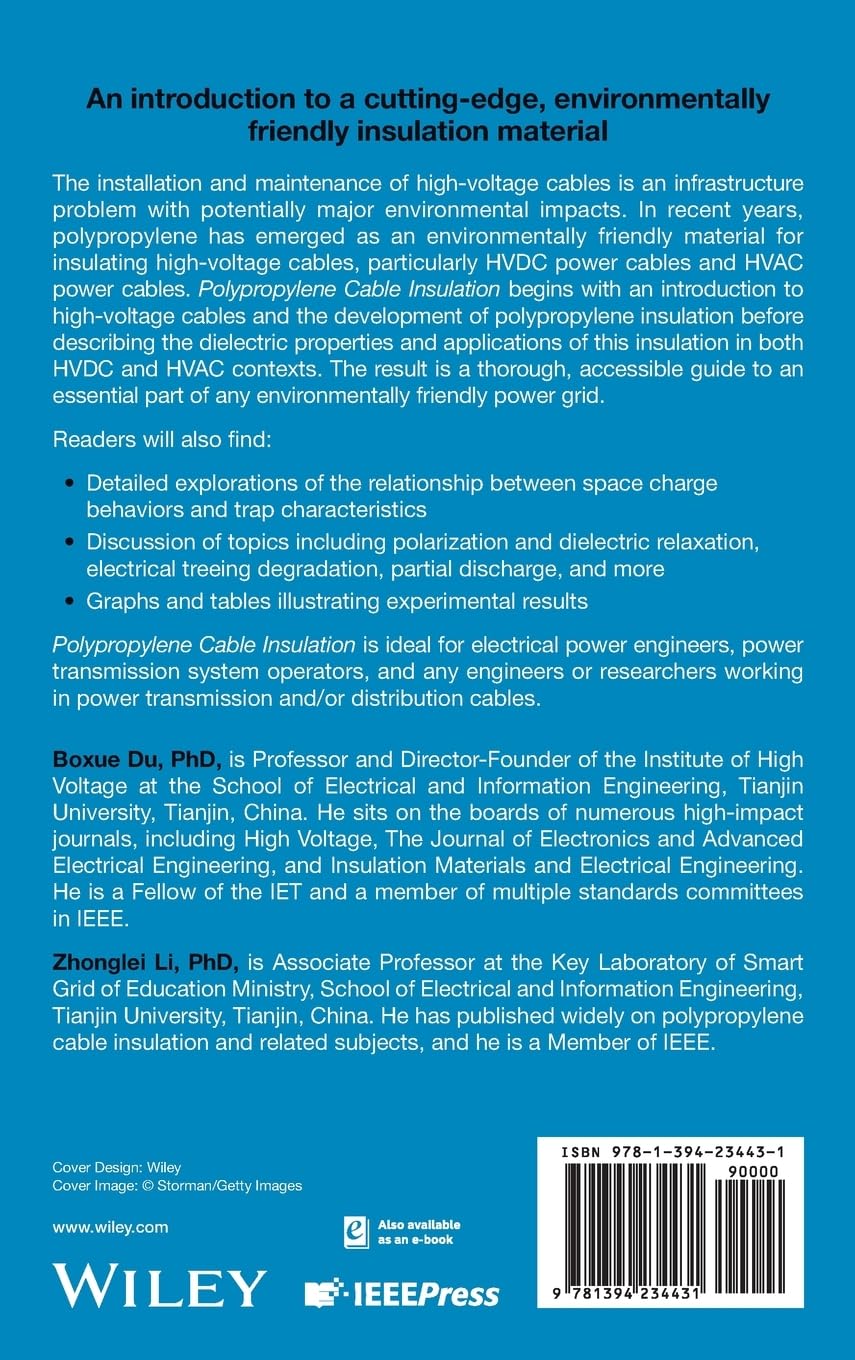 The installation and maintenance of high-voltage cables is an infrastructure problem with potentially major environmental impacts. In recent years, polypropylene has emerged as an environmentally friendly material for insulating high-voltage cables, particularly HVDC power cables and HVAC power cables. Polypropylene Cable Insulation begins with an introduction to high-voltage cables and the development of polypropylene insulation before describing the dielectric properties and applications of this insulation in both HVDC and HVAC contexts. The result is a thorough, accessible guide to an essential part of any environmentally friendly power grid.