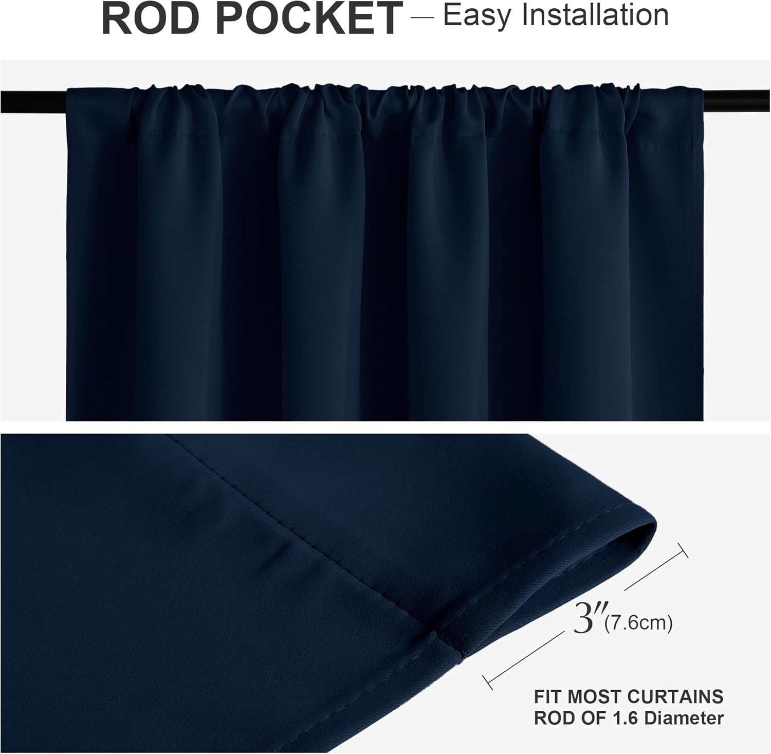 Package Contents: Includes 2 panels, each measuring 42 inches wide by 72 inches long with a 3″ rod pocket that fits most standard rods. Both sides are uniformly colored for a sleek look.