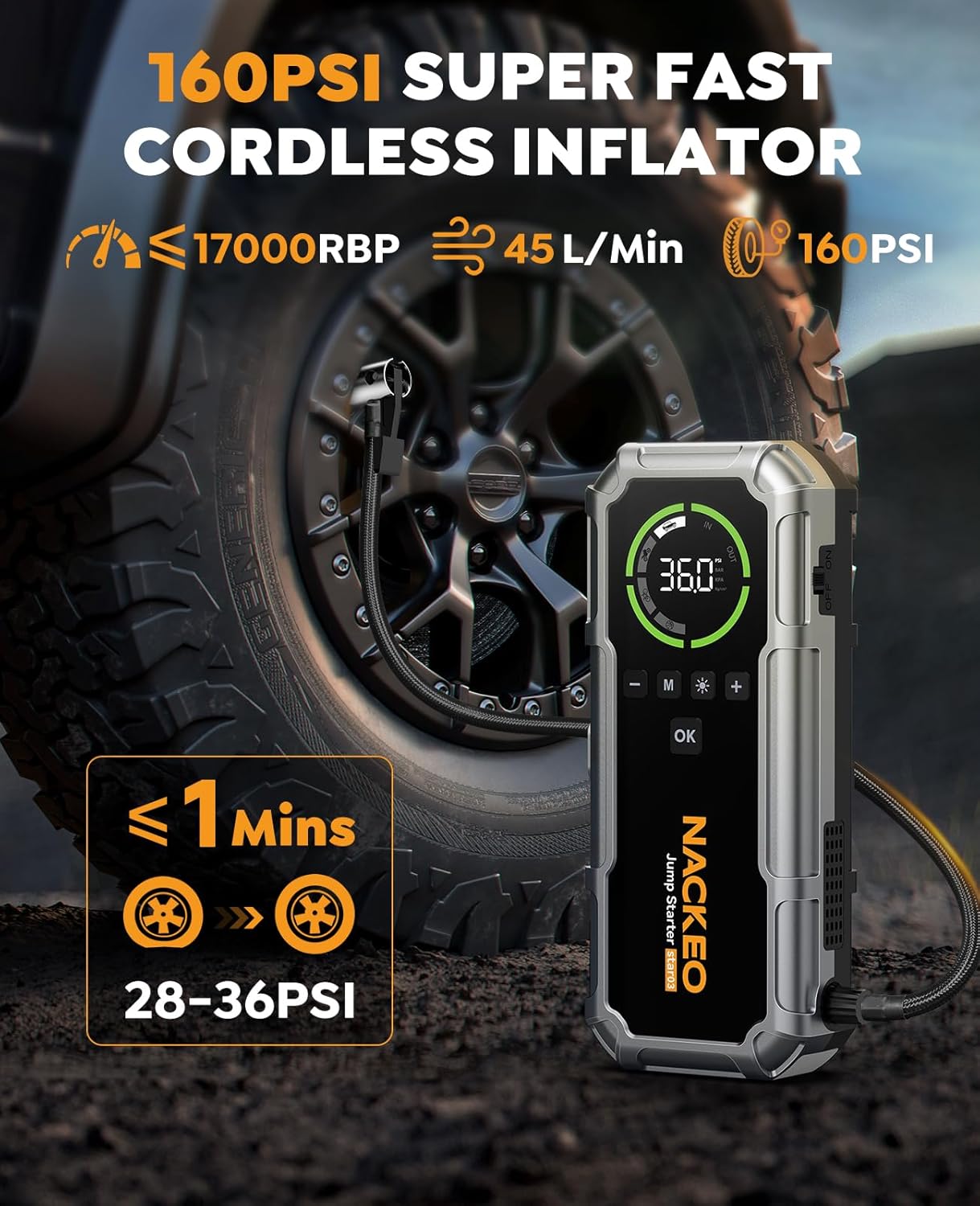 Be the first to review “Portable Car Jump Starter with Air Compressor 7000A 160PSI, NACKEO Car Battery Jump Starter (All Gas/10L Diesel),12V Jump Box Car Battery Jumper Starter Portable with Large LCD Display, 500lm Lights”