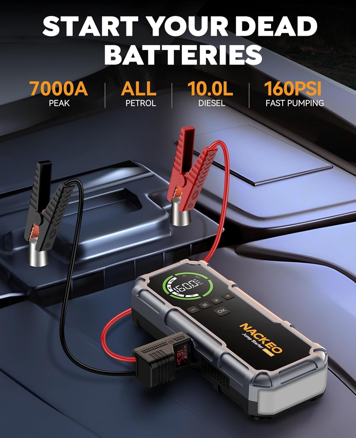 Portable Car Jump Starter with Air Compressor 7000A 160PSI, NACKEO Car Battery Jump Starter (All Gas/10L Diesel),12V Jump Box Car Battery Jumper Starter Portable with Large LCD Display, 500lm Lights