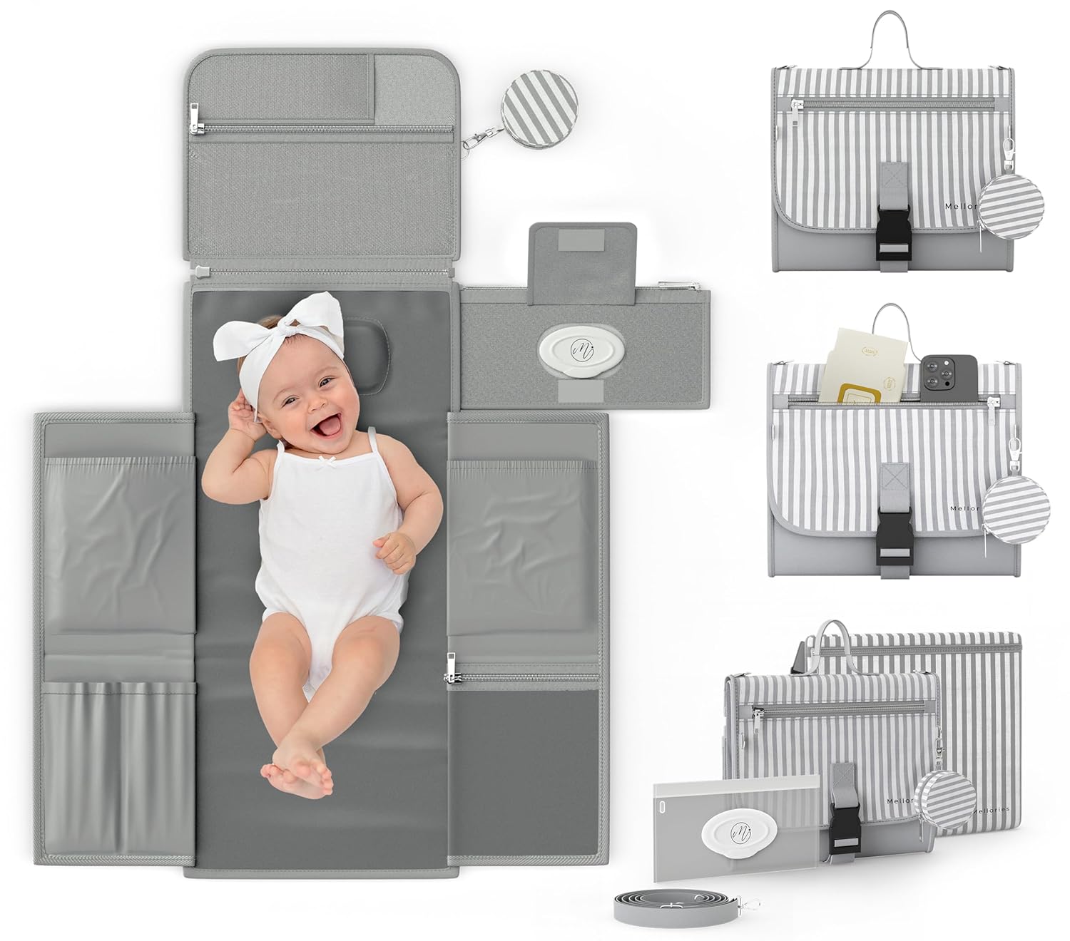 Portable Diaper Changing Pad – Large, Waterproof Travel Changing Pad for Baby with Extra Storage, Wipes Pocket & Pacifier Case – Portable Diaper Changing Station – Gray Striped
