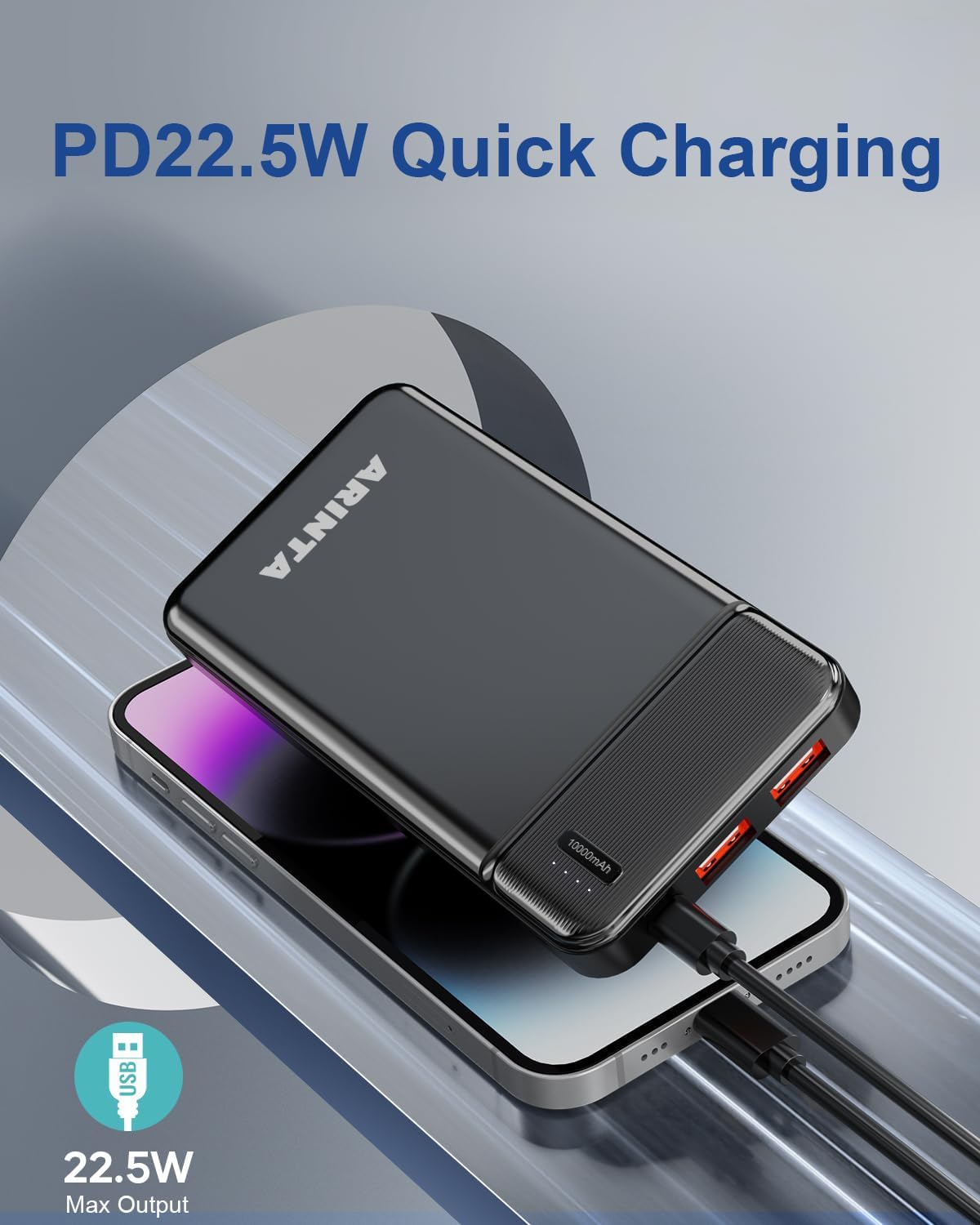 Power Bank Portable Charger 10000mAh PD 22.5W, Ultra Slim Battery Pack with USB-C Input/Output, Compatible for iPhone 16 15 14 13 12, Galaxy S24 23 22 21, Tablets., etc. (Black)