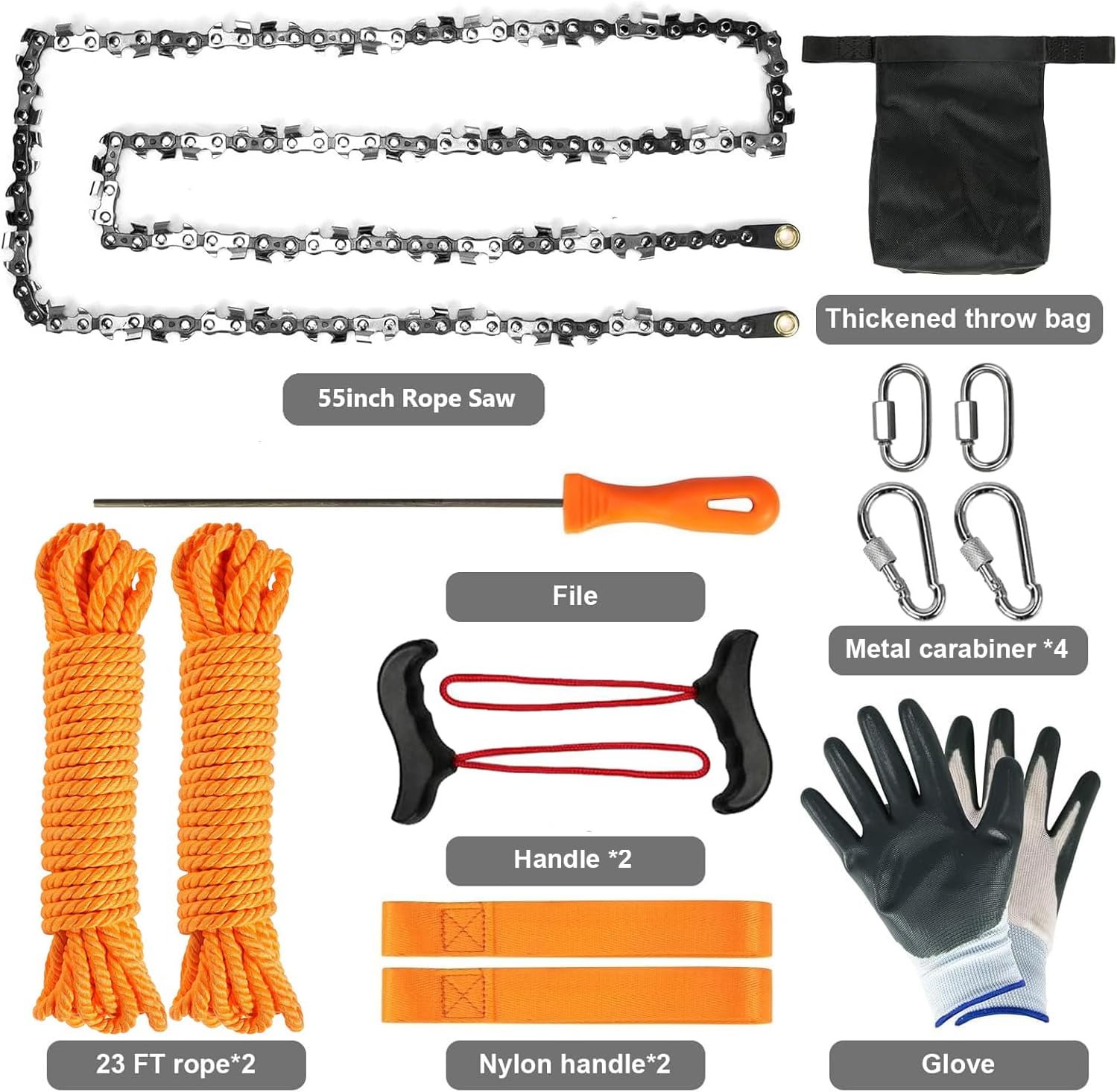 LOTS OF FREEBIES -If you purchase our chainsaw, you will get 2 emergency safety ropes each 23 ft (2 ropes totaling 46 ft), 2 sturdy nylon braided handles, 2 ergonomic handles, 4 metal carabiners, a glove, a round file and throw weight bag