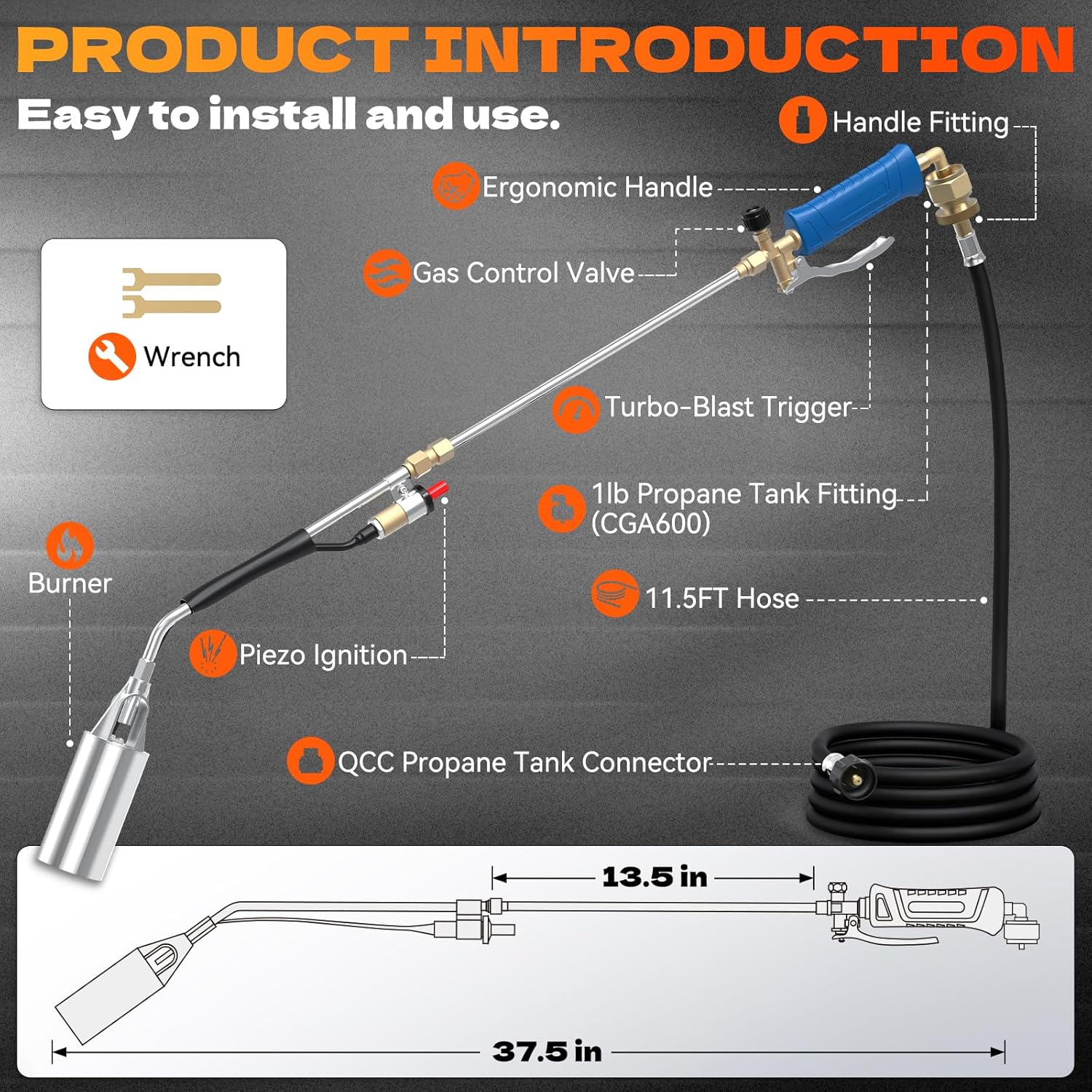 Ergonomic Build to Prevent Back Fatigue – When fully assembled, the torch measures 37.5 inches long, paired with an 11.5ft 3-layer PVC hose that’s heat-, wear-, and scratch-resistant. This setup lets you work standing up—no bending required—minimizing discomfort during extended use and making it perfect for gardeners and farmers.