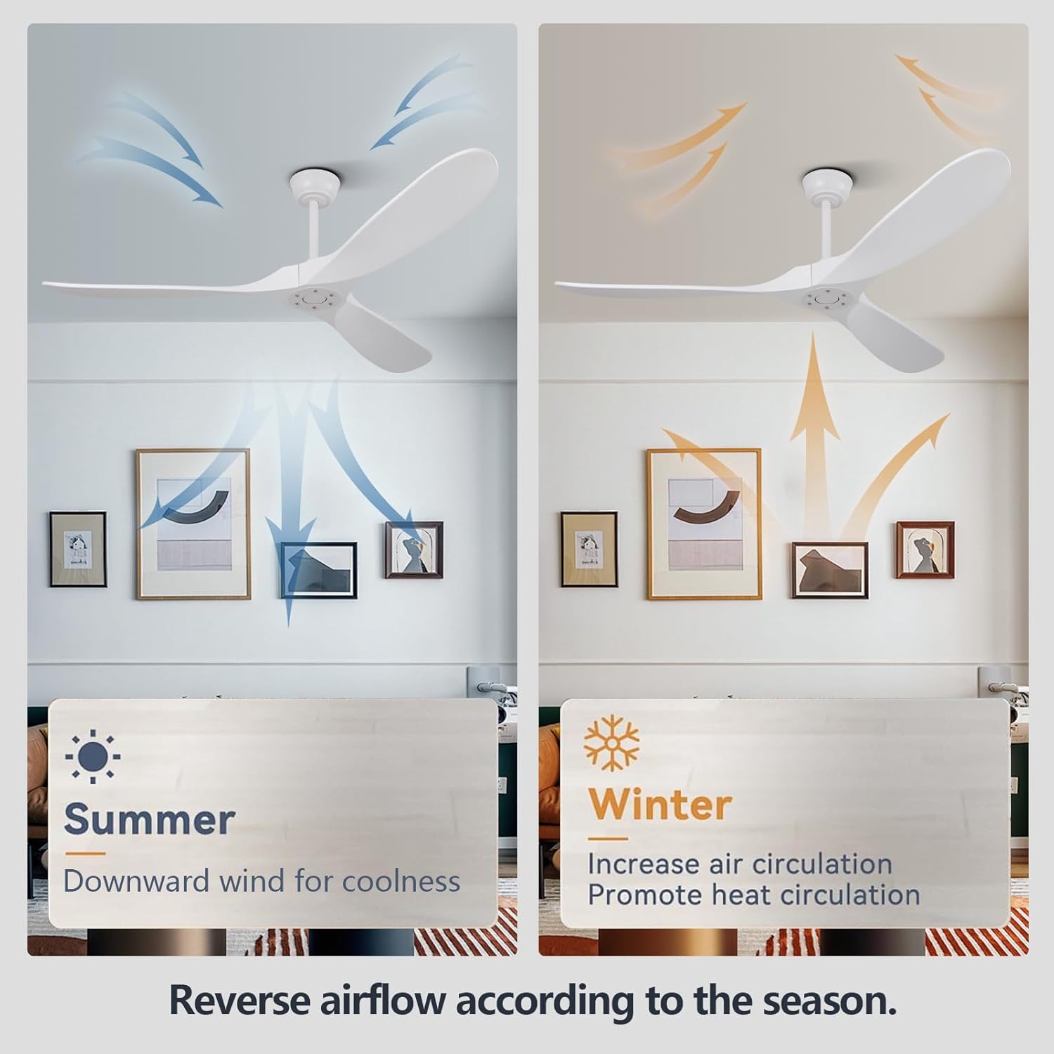 Energy-saving and Comfortable: This energy efficient ceiling fan no light is equipped with a reversible DC motor, perfect for all seasons. In summer, the ceiling fan blades spin counterclockwise to provide a cooling breeze; In winter, they spin clockwise to circulate warm air. This function helps maintain a comfortable indoor temperature and reduces energy costs.