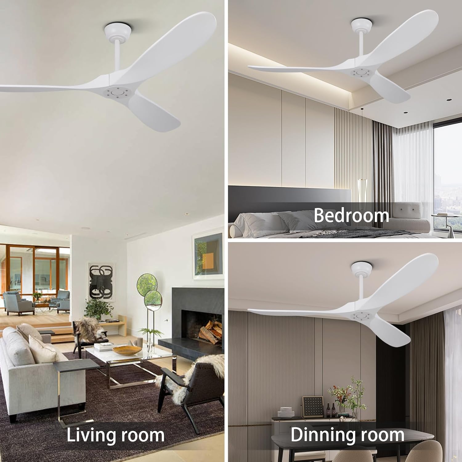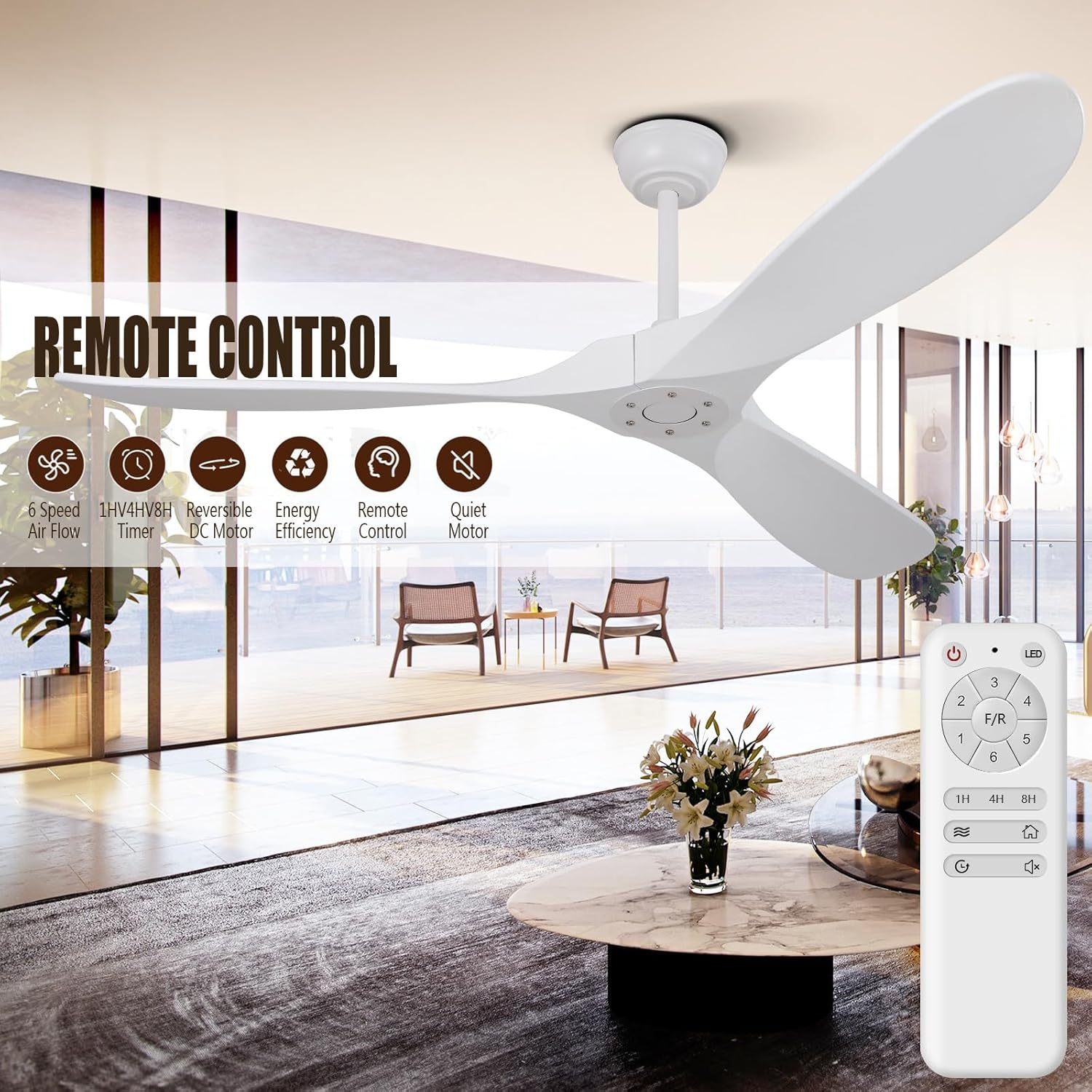 Silent DC Motor and Convenient Remote: Enjoy a peaceful atmosphere with our quiet white ceiling fan no light that features a silent DC motor. The included remote control makes the ceiling fan is easy to manage six speed settings, timers (1/4/8 hours), and airflow direction adjustments. This large wood ceiling fan no light with remote delivers outstanding performance while maintaining quiet operation.