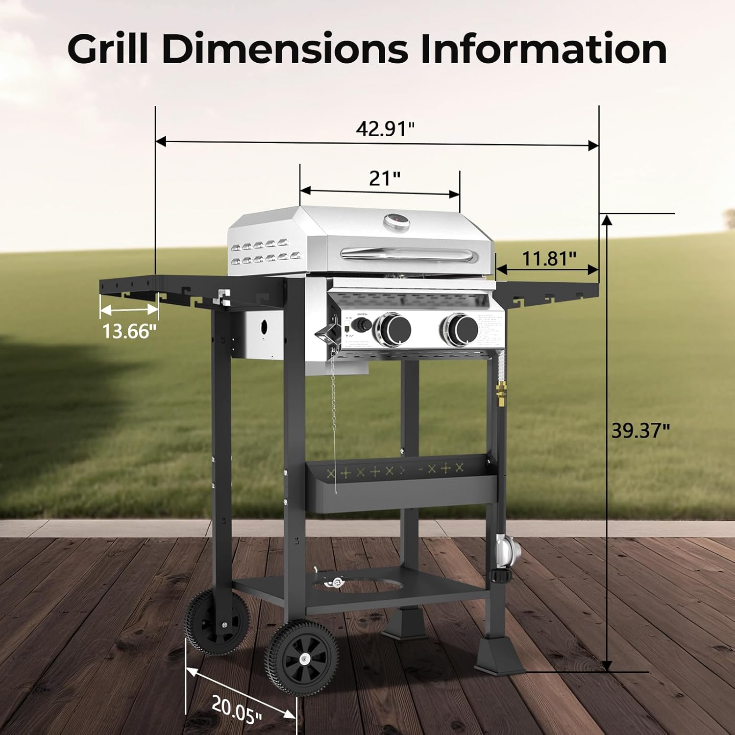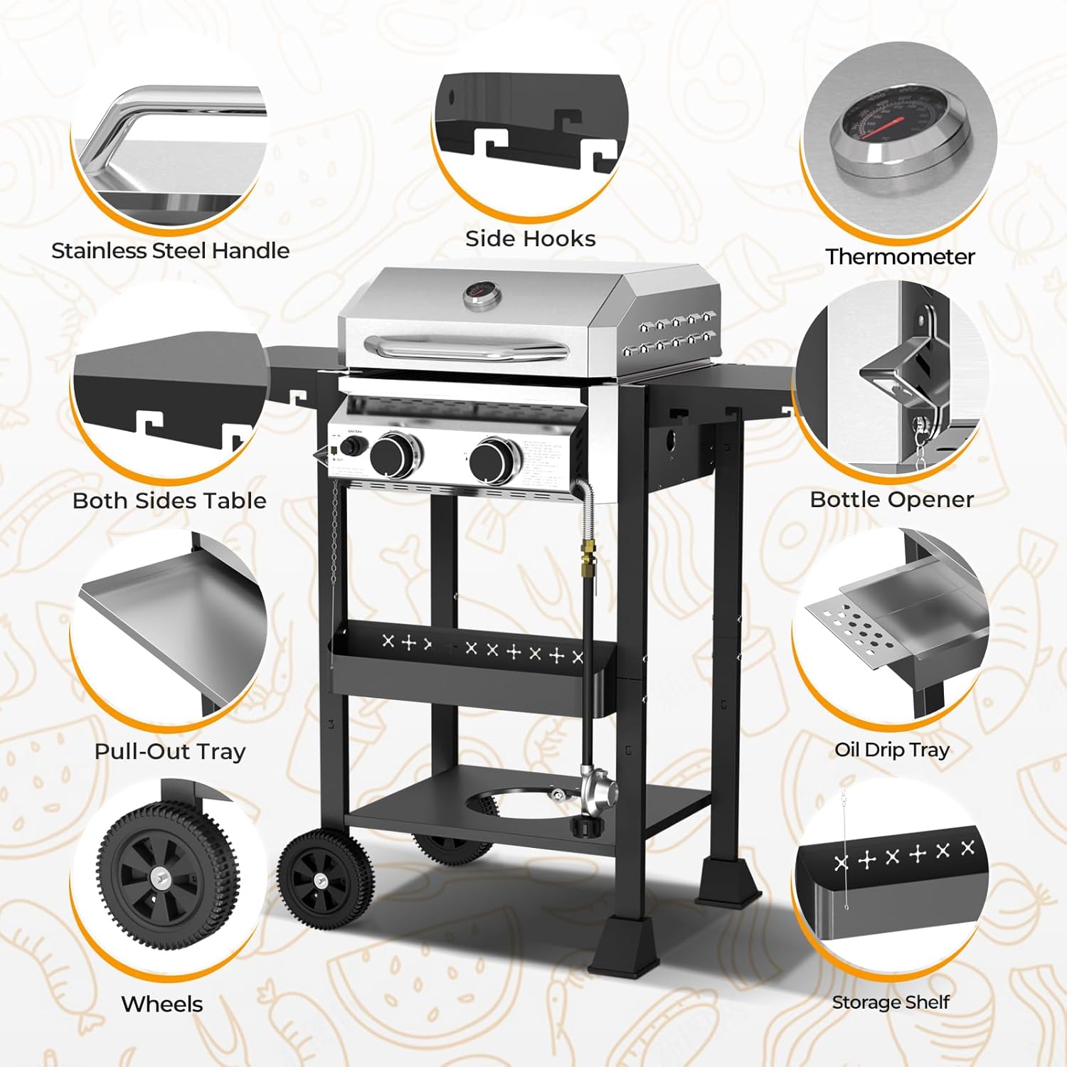 R.W.FLAME G20B Propane Gas Grill with 2-Burner, 16000 BTU Stainless Steel Outdoor BBQ Grill for Cooking with Top Cover Lid,Wheels,Side Storage Shelves,hooks Portable Barbeque for Patio Garden Camping