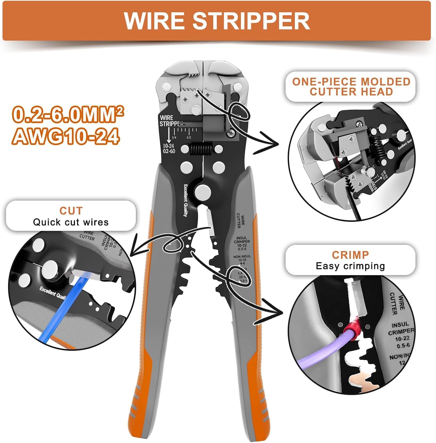 This tool kit is awesome for stripping and crimping wires without the usual hassle. The automatic stripper works smoothly, and the crimper is solid for all the connectors Iâve used so far. Fits a good range of wire sizes, and it feels comfortable to hold. Definitely made my wiring projects quicker and less frustrating.