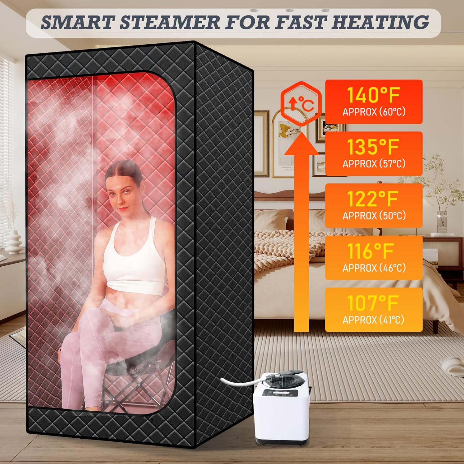 【Large Capacity Steamer Generator 】: With a 3.0L steam pot(full of water) and 16 temperature settings, this portable home sauna boasts a quick heat-up time of just 6-10 minutes, reaching a maximum temperature of 130°F(affected by the environment). Its 360°omni-directional steam nozzle, powered by a 1300W steam engine, efficiently fills the entire steam tent for a faster and better sauna experience