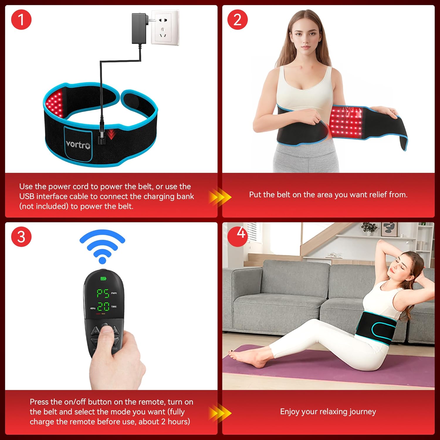 【𝙉𝙤𝙩 𝙖 𝙃𝙚𝙖𝙩𝙞𝙣𝙜 𝘽𝙚𝙡𝙩!!!】The Vortro red light therapy is not a heating pad. It primarily uses red and infrared light for therapy effects, not heat. It doesn’t have a battery and isn’t wireless.Please kindly know that.