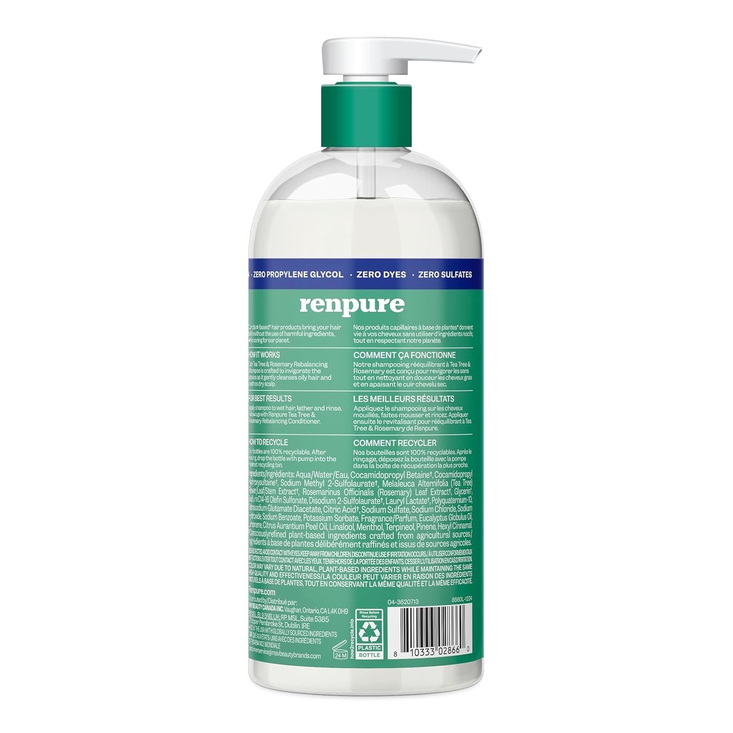Renpure Plant Based Tea Tree and Rosemary Refresh and Rebalance Shampoo is crafted to invigorate the senses as it gently cleanses oily hair and soothes dry scalp, balancing moisture and shine. At Renpure, our naturally derived shampoos and conditioners bring your hair to life without the use of harmful ingredients, while caring for our planet. Our pump and bottle are both 100 percent recyclable and made from post consumer recycled plastic, making sustainable choices easier.