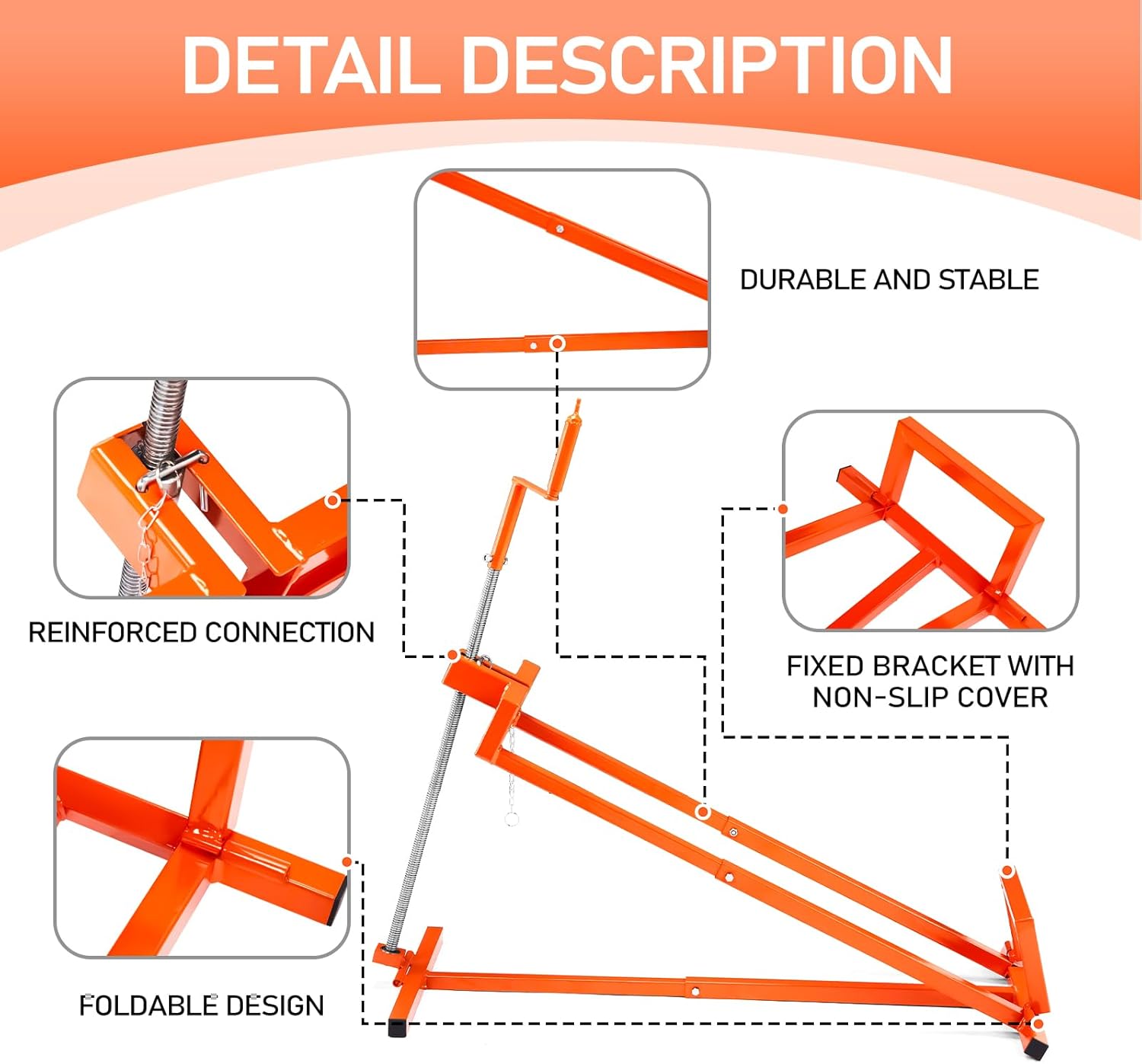 Precision-Adjustable Lifting System: Enhance maintenance efficiency with a telescoping arm (extending to 28″) and 0-45°tilt functionality, ensuring optimal access for blade changes, tire maintenance, and mechanical repairs across diverse equipment.