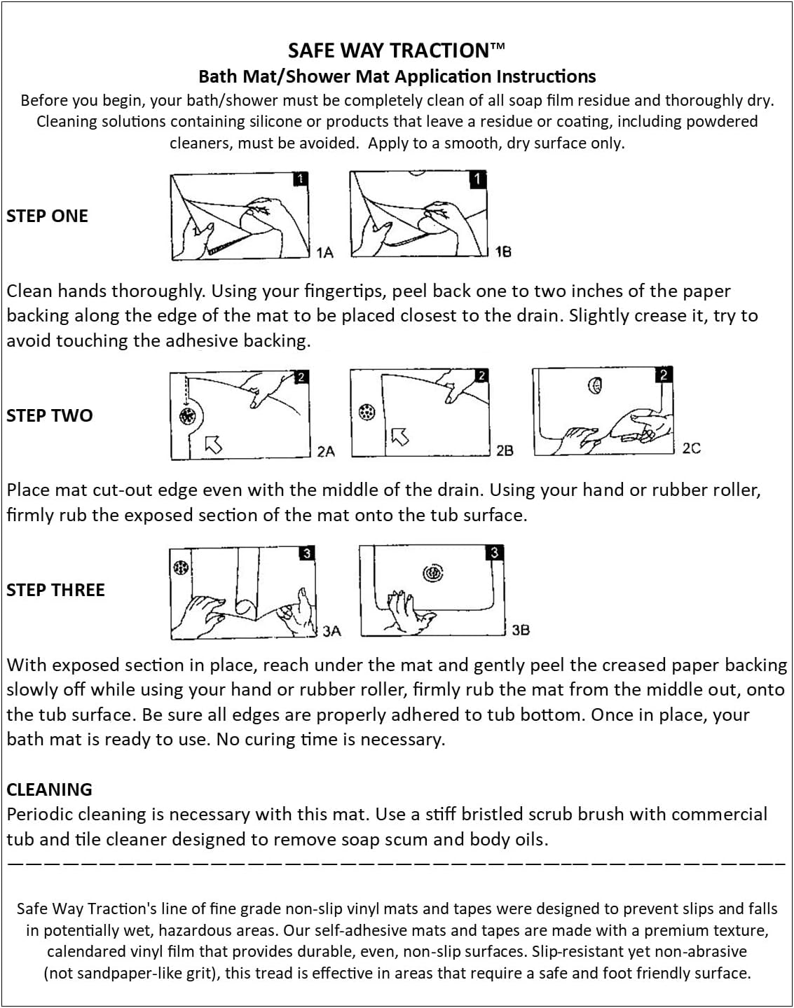 Peel and stick down installation for wet, slippery areas. Apply to smooth / flat surfaces only. This fine grade adhesive bath mat from Safe Way Traction has been engineered for foot-friendly, no-slip protection in showers, bathtubs and bathing areas. Bath tub and shower safety. It is perfect for exercise and gym equipment. Does not have suction cups.