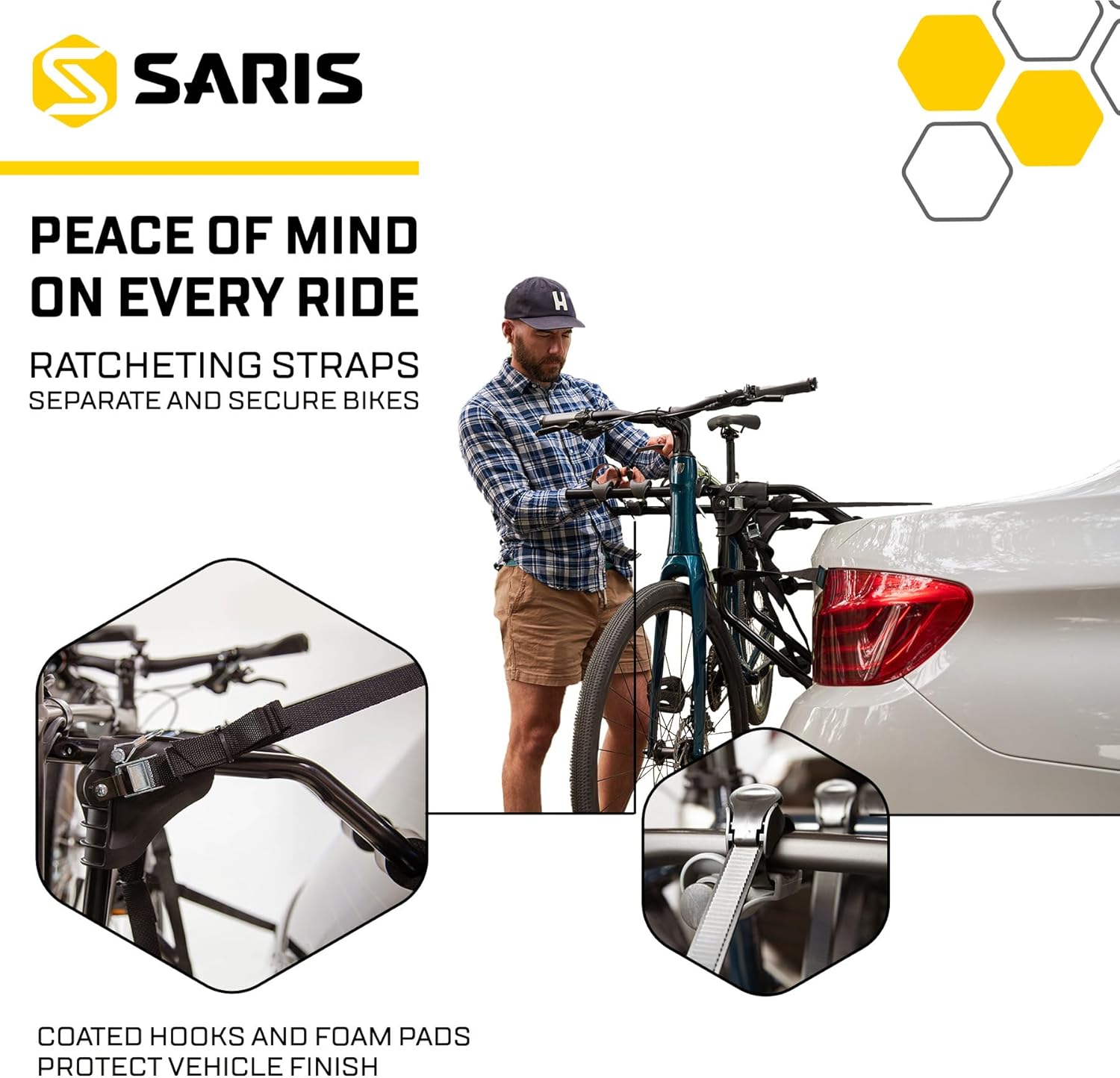 Take your biking adventures to the next level with the Saris Guardian Trunk Bike Rack, a no-hitch bicycle carrier designed for sedans, hatchbacks, SUVs, vans, and trucks. Whether you’re commuting, road-tripping, or hitting the trails, this foldable steel bike mount makes transporting your bikes effortless and secure—no hitch required. Experience hassle-free bike transport with the Saris Guardian Trunk Bike Rack, the ultimate no-hitch solution for cyclists who need a simple, reliable, and secure way to carry their bikes. With fully assembled out-of-the-box convenience, setup is a breeze—just unfold, secure the adjustable straps, and load up your bikes. Spring-loaded buckles and ratcheting straps ensure a rock-solid attachment to your vehicle, keeping your bikes stable even on rough roads. Each bike is held firmly in place with easy-to-use frame hold-downs, giving you peace of mind throughout your journey. Crafted from American-made steel, this rack is built to last. It accommodates up to three bikes (35 lbs. each) and features adjustable arms for a customized fit. When not in use, the compact, foldable design allows for easy storage in your trunk, garage, or closet. Plus, heavy-duty foam pads and coated hooks protect your vehicle’s finish, ensuring a scratch-free experience.