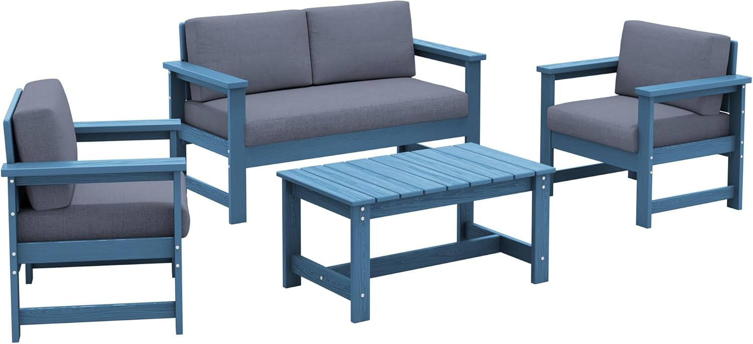 SERWALL 4 Pieces HDPE Outdoor Sofa Set with Cushion, All Weather Use Conversation Couch Set, Outdoor Loveseat Social Furniture with Coffee Table and Cushions, Blue Frame with Grey Cushions