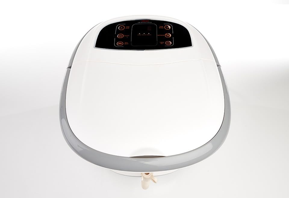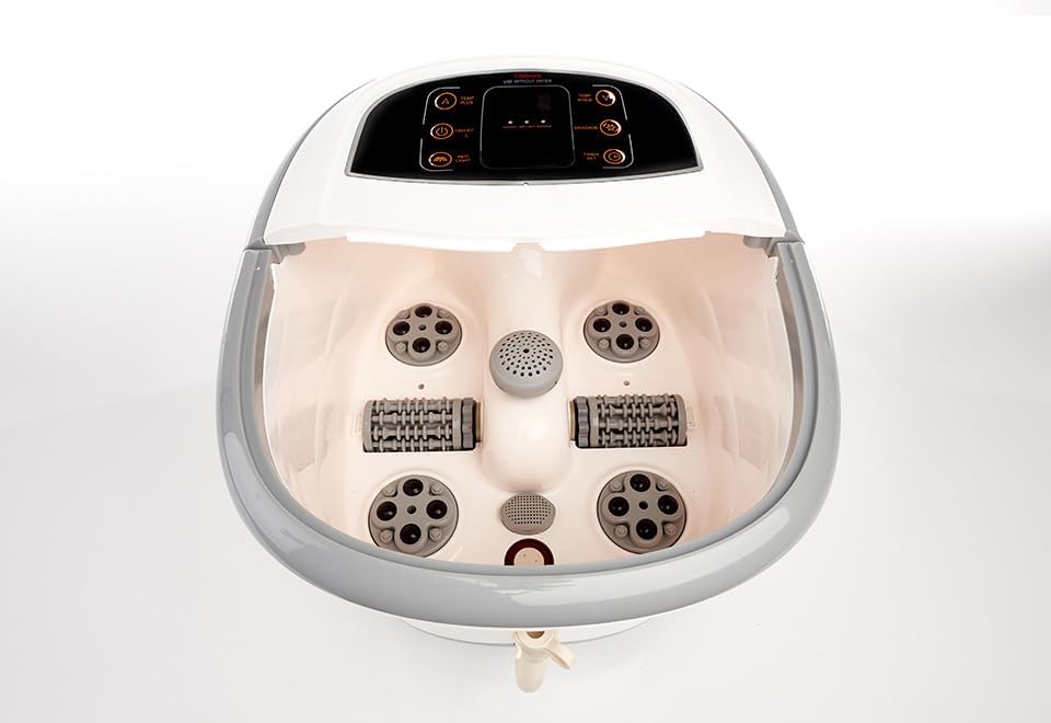 Calf-deep water with hydro jets for reflex zone stimulation Adjustable heat (95°F to 116°F) with auto-balancing system Four motorized foot rollers for soothing massages Fits up to Women’s size 12 and Men’s size 13 feet Portable handle and casters for easy transport