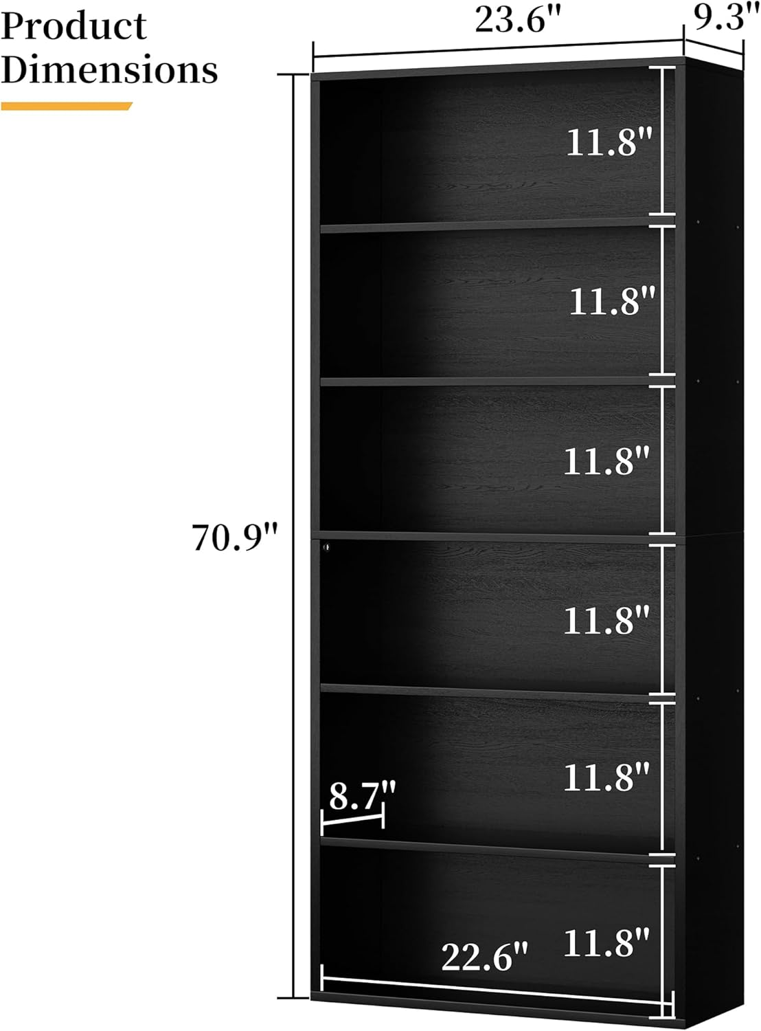 Shintenchi Bookshelf,6-Tier Open Bookcase and Bookshelves,6 Shelf Display Storage Shelves Floor Standing 70.6 inches Tall Bookcase for Home Office, Living Room (Black)