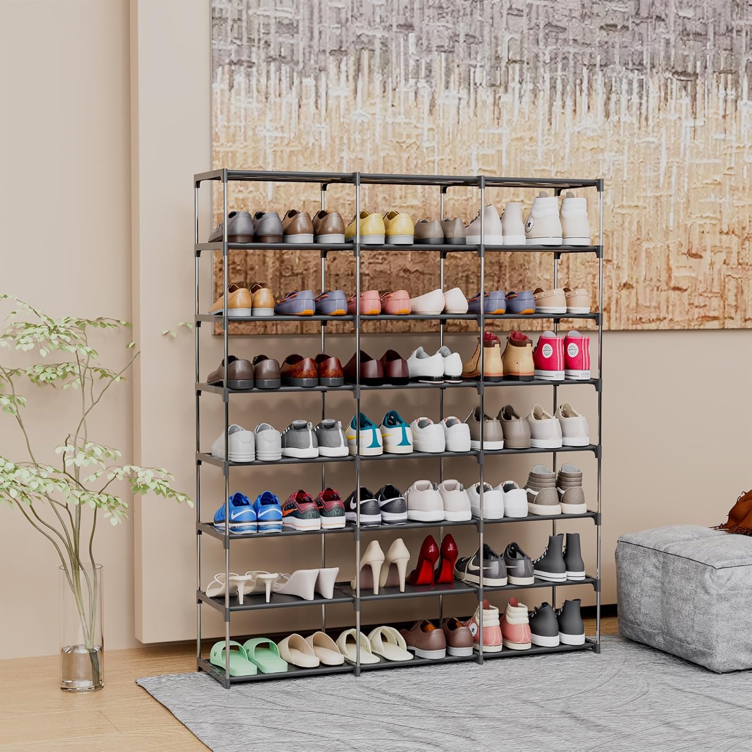 Measuring 50.8″L x 49.2″H x 10.8″W, this shoe tower unit is perfect for use in entryways, hallways, and closets in households of all sizes. Each grid measures 16.7″L x 10.8″W x 8.3″H, ensuring there is enough space to accommodate different sizes and style’s shoes. Whether you have sneakers, boots, or sandals, this shoe rack fits all.
