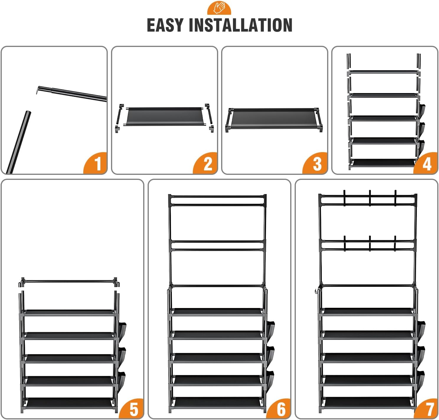 Quick and Hassle-free Assembly: This closet shoe storage rack is easy to install with the help of the instruction and clear directions. A disposable hammer help make shoe rack steady. Please avoid exposing under sun and rain.