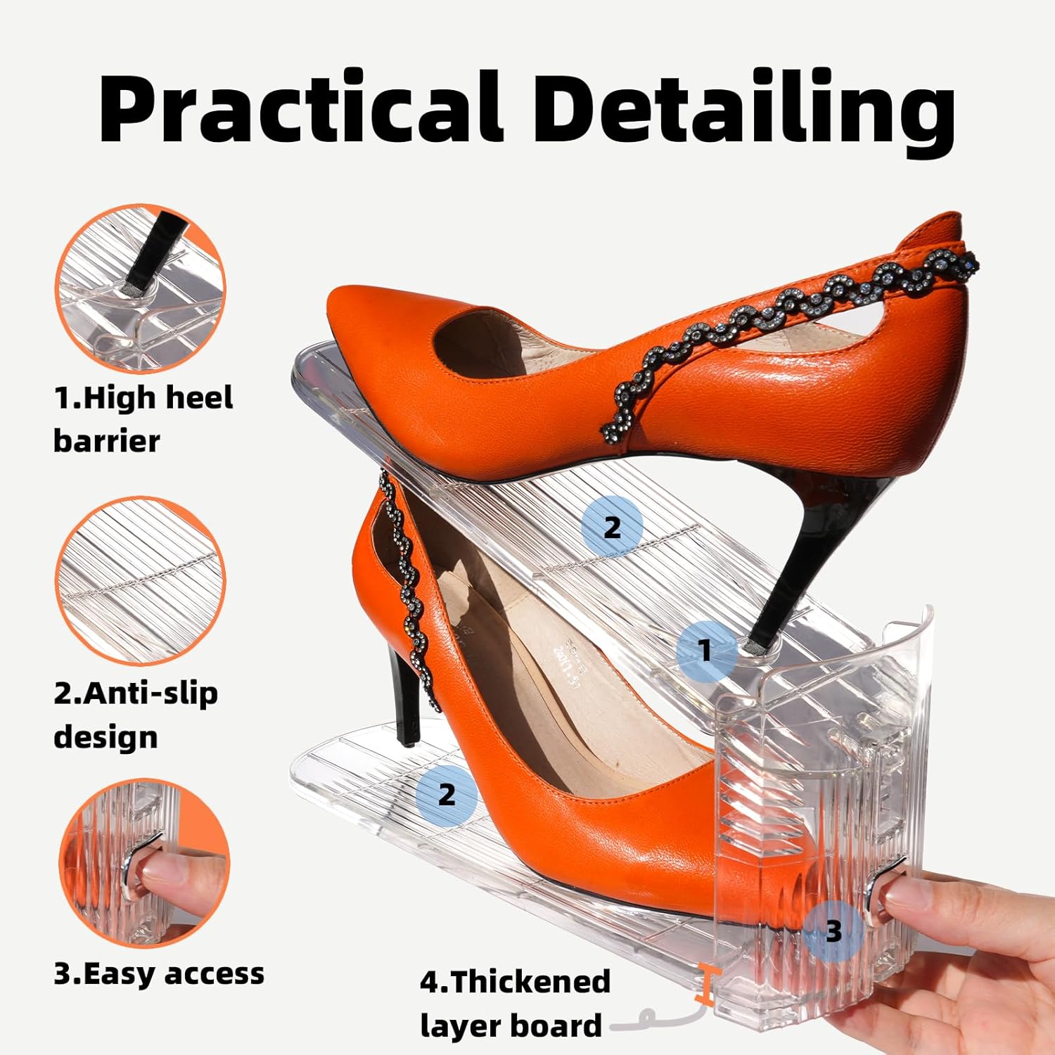 Three-POSITION FLEXIBLE ADJUSTABLE – Adjustable heights from 3.9”, 5.9” to 7.9”, perfect for all kinds of shoes, whether it’s flat shoes or high-heeled (the size should bellow 9). Adjustable heights ensure a perfect fit for all your footwear