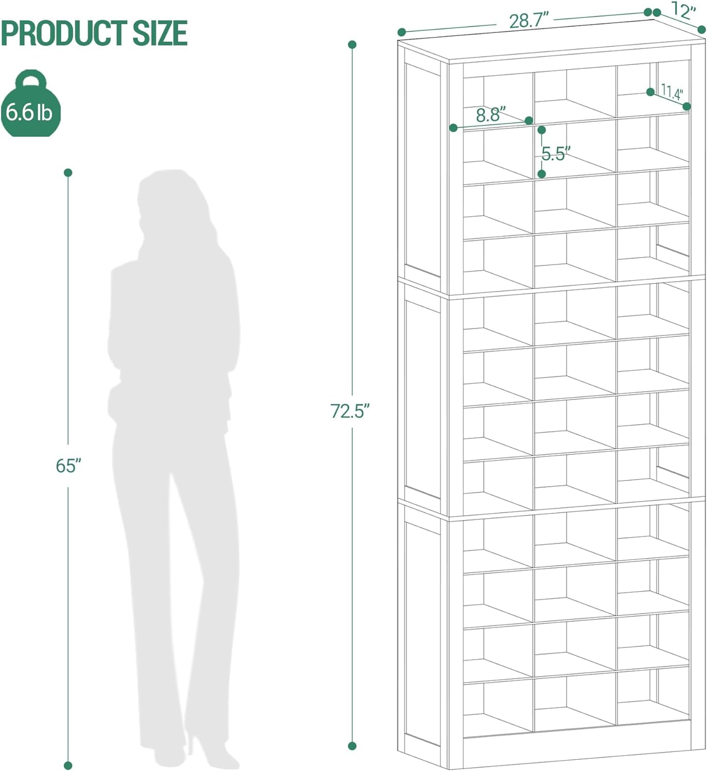 Space-Saving and Practical Shoe Rack: This tall shoe cabinet measures 12″D x 28.7″W x 72.4″H and can accommodate up to 36 pairs of shoes. Great for use in small spaces. It makes full use of vertical space and takes up very little space, making it ideal for entryways, living rooms, bedrooms, hallways and storage rooms, etc.