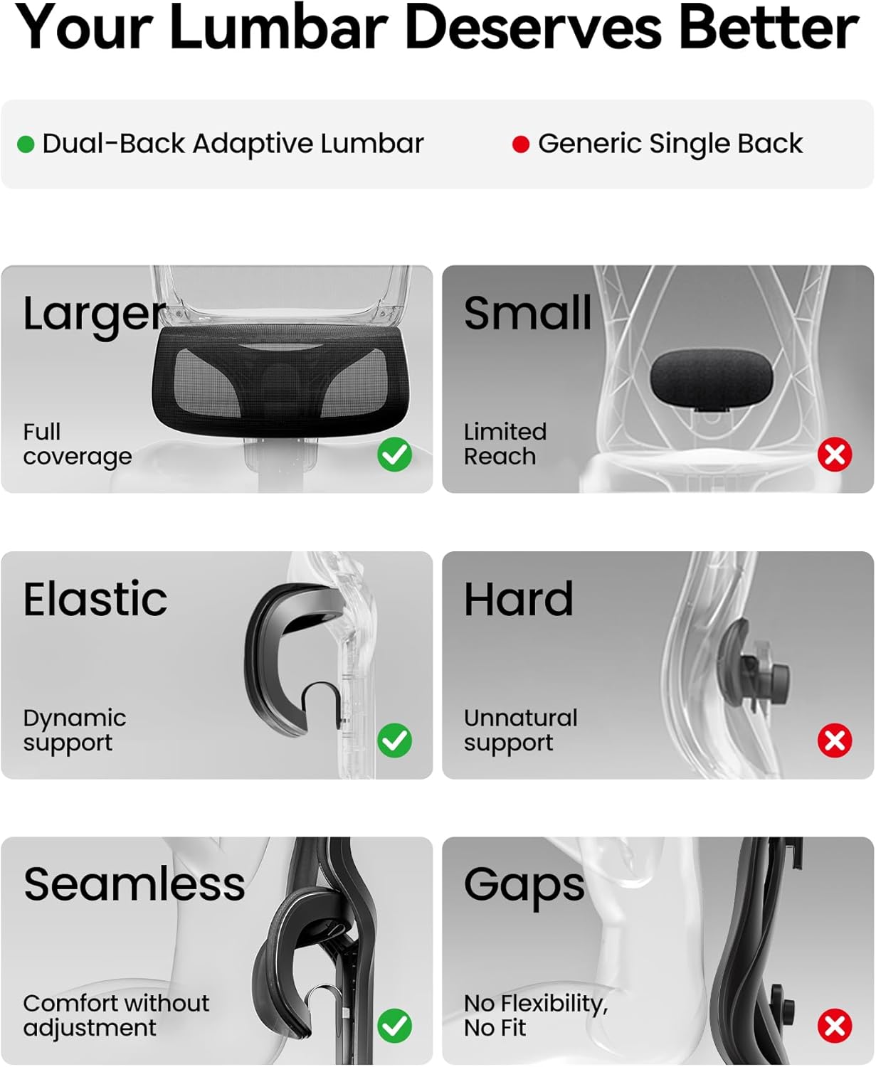 【Dynamic Lumbar & Back Support】The 3D adaptive lumbar pillow flexes with your movements to keep your spine aligned and lower back properly supported—whether you’re typing upright at your desk or reclining to 125° for a breather. Paired with a widened, reinforced backrest, it provides full-length back support that eases tension and helps you stay comfortable all day long.