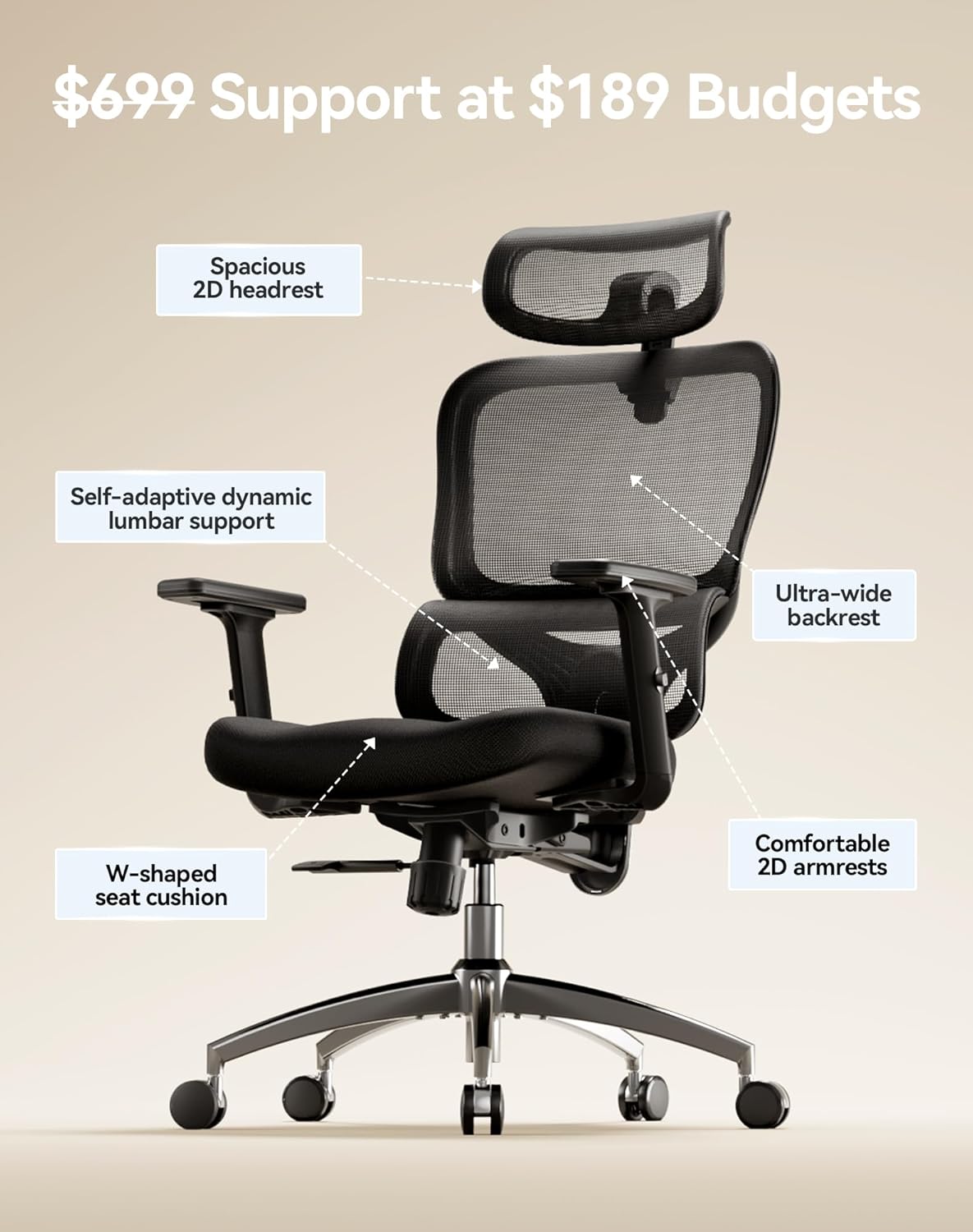 【Premium Ergonomic Comfort】The oversized 2D headrest (height/tilt adjustable) cradles your head and neck to reduce strain, especially during long work calls or focused tasks. The W-shaped seat cushion evenly distributes weight to ease pressure on your hips and thighs, while the breathable mesh and soft armrests keep you cool and supported through every hour of sitting.