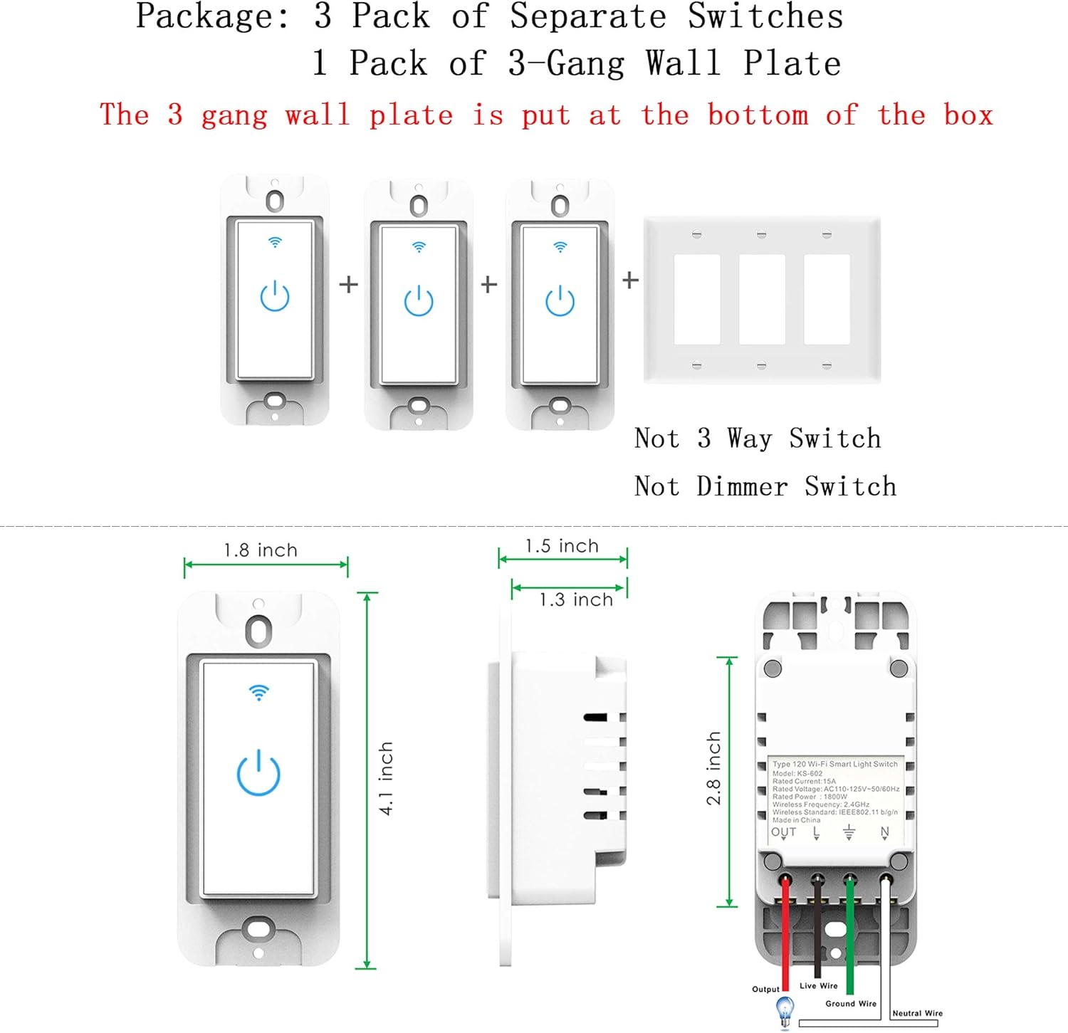 NOTE: Single-pole application only. Neutral wire is required. Only works with 2.4 GHz Wi-Fi network. Package include: three separate switches with one 3-gang wall plate. The 3 gang wall plate is put in bottom of the packing box.