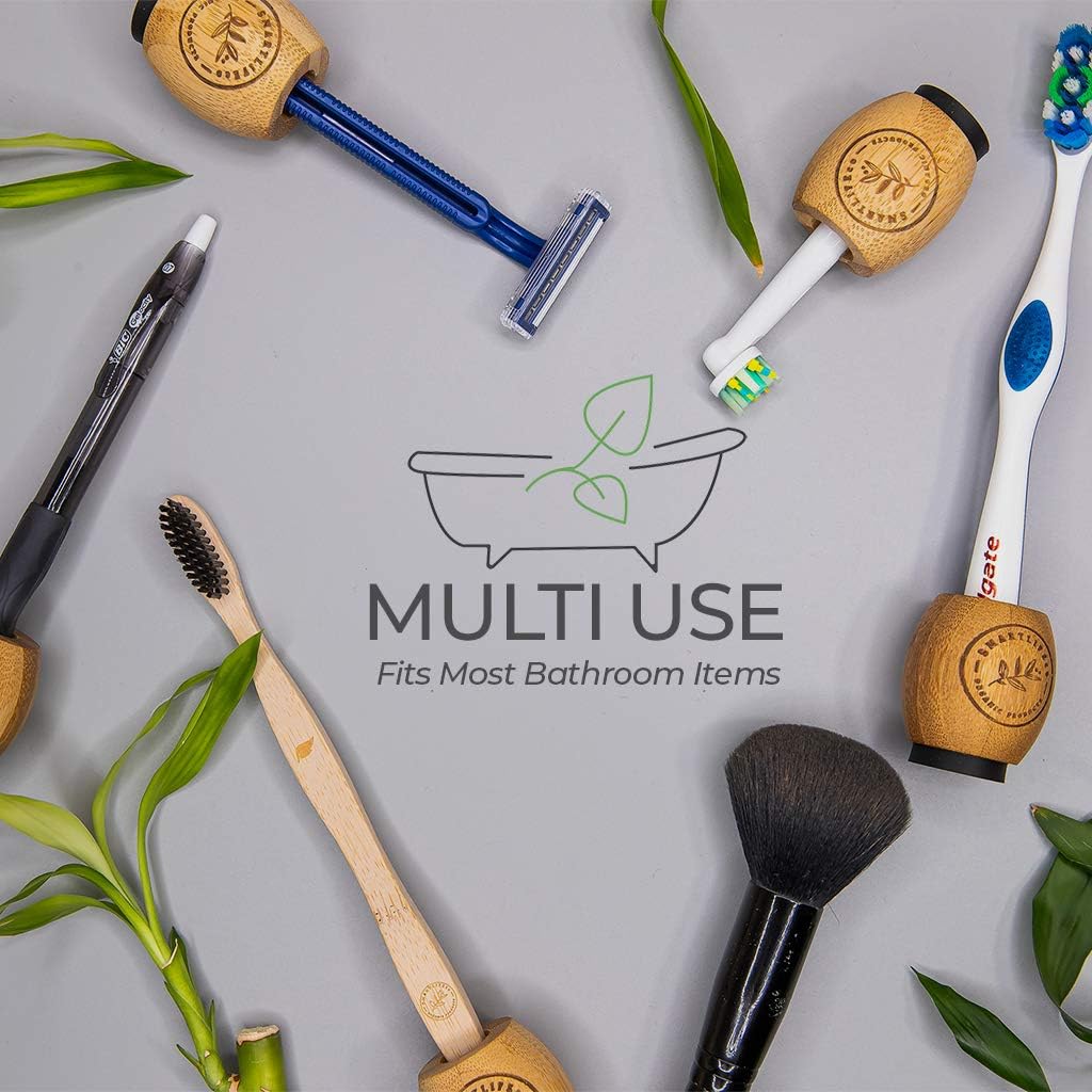 MULTI-USE: This multifunctional holder works with bamboo toothbrushes, plastic tooth brushes, makeup brushes, qtip, oral-b electric toothbrush heads, razers, toothpicks, floss picks, pens and more!