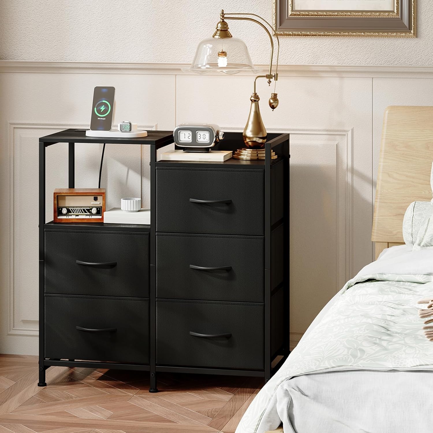 Multi-functional Storage: This nightstand serves as a charger and bedside table all in one with 2 USB ports, 2 standard sockets, 5 fabric drawers, and a open shelf for books or décor.